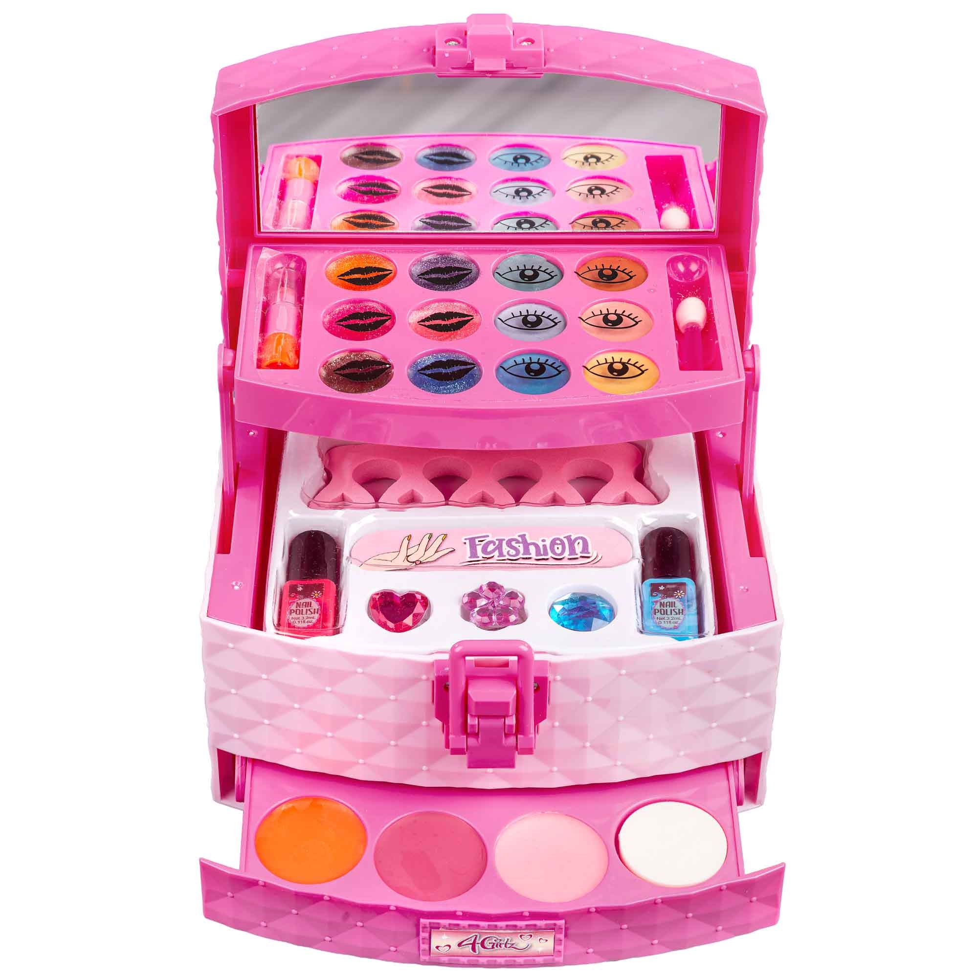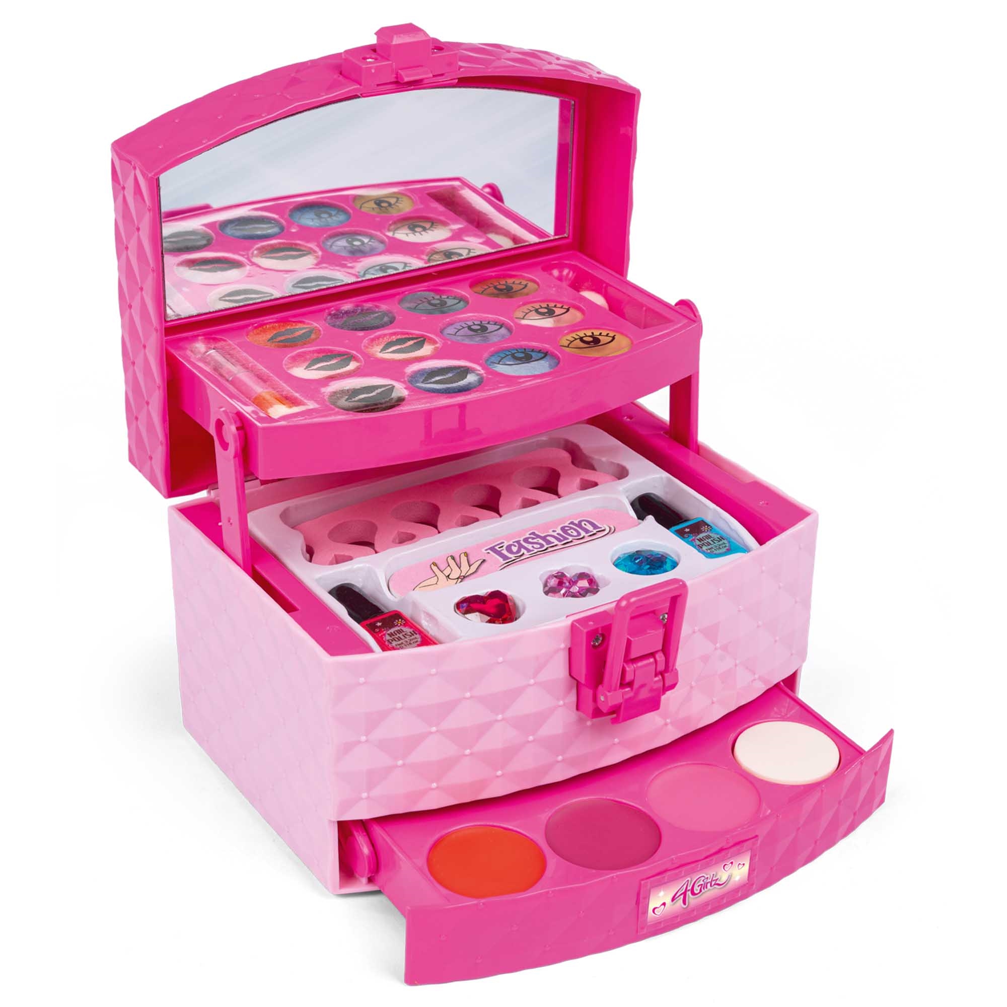 Makeup håndtasken indeholder et spejl 16x13 cm, øjenskygge, lipgloss, blush og et negle sæt med neglefil, tåspreder, neglelak og diamanter til pyntning af neglene.