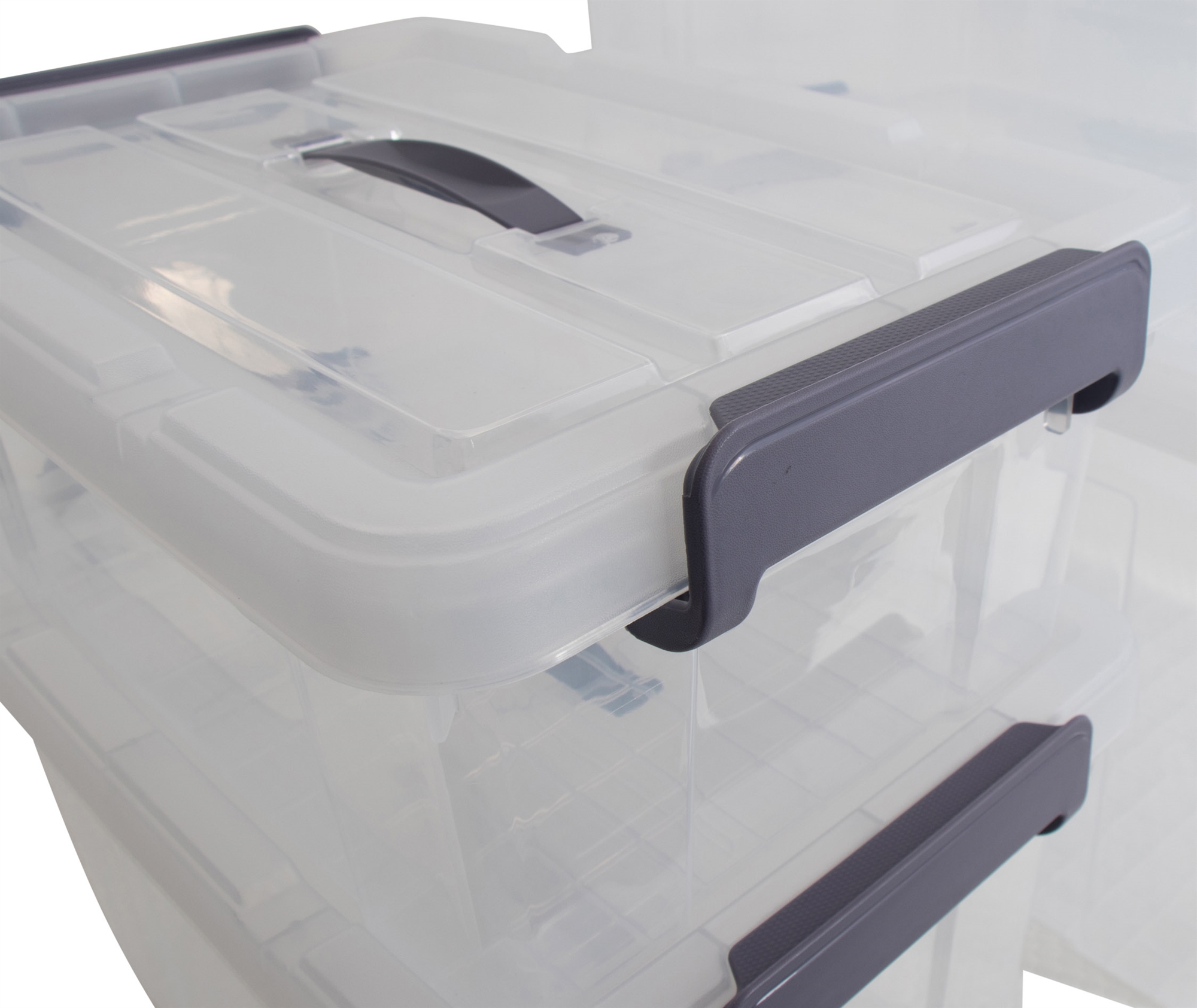 Den transparente plastik gør det nemt at se, hvad der er indeni hver kasse, så du altid kan finde det, du leder efter. Låget er tætsluttende og klikkes let på plads med kraftige lukkeclips, der sikrer, at dine ting forbliver intakte.