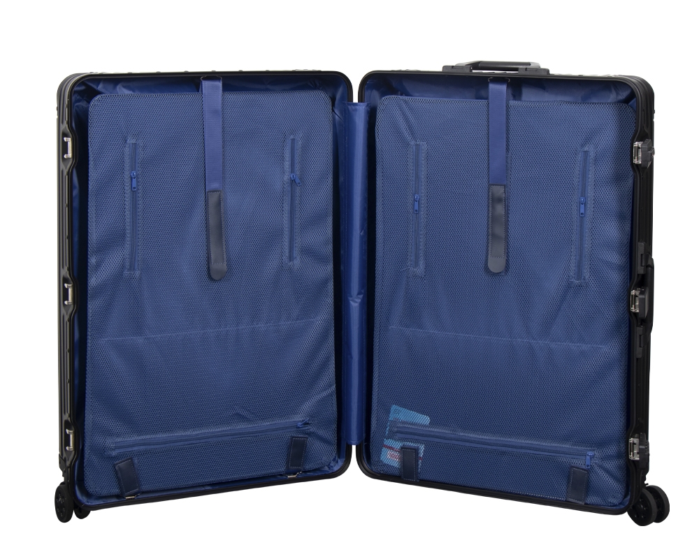 Indvendigt i kufferten finder du to pakkeplader, der kan tages helt ud og bruges som dragtposer til tøj som skjorter og kjoler, eller med aftagelige poser til strømper og undertøj. Pakkepladerne spændes fast via indvendige stropper, der komprimerer tøjet og holder det på plads under hele rejsen.