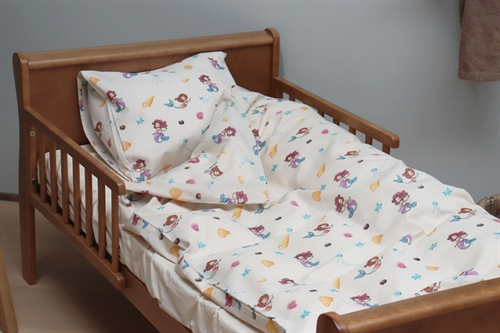 Skønt sengesæt med super fint print af små havfruer. Dette flotte all-over print i dæmpede farve, skaber en afslappende stemning og hyggelige omgivelser til søvn. Baby sengetøjet passer til en almindelig babydyne størrelse og kan bruges i sengen, i babynesten, i barnevognen eller hvor end dynen medtages. Babydynen er ofte fast omkring barnet i mange af døgnets timer, da den skaber stor ro, genkendelighed, tryghed og varme for babyen - ikke kun den første tid, men ofte op til 2-3 års alderen. Det bruges derfor rigtig meget og bliver vasket ofte, og derfor ønsker de fleste også blødt sengetøj i bomuld af høj kvalitet.