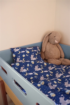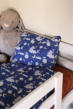 Sødt sengesæt med all-over motiv af elefanter, omgivet af stjerner og måner på en blå baggrund. Baby sengetøjet passer til en almindelig babydyne størrelse og kan bruges i sengen, i babynesten, i barnevognen eller hvor end dynen medtages. Babydynen er ofte fast omkring barnet i mange af døgnets timer, da den skaber stor ro, genkendelighed, tryghed og varme for babyen - ikke kun den første tid, men ofte op til 2-3 års alderen. Det bruges derfor rigtig meget og bliver vasket ofte, og derfor ønsker de fleste også blødt sengetøj i bomuld af høj kvalitet.