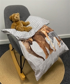 Sødt, vendbart sengesæt med print af en elefant, en giraf og en zebra på en stribet baggrund, og bagsiden med cirkler . Baby sengetøjet passer til en almindelig babydyne størrelse og kan bruges i sengen, i babynesten, i barnevognen eller hvor end dynen medtages. Babydynen er ofte fast omkring barnet i mange af døgnets timer, da den skaber stor ro, genkendelighed, tryghed og varme for babyen - ikke kun den første tid, men ofte op til 2-3 års alderen. Det bruges derfor rigtig meget og bliver vasket ofte, og derfor ønsker de fleste også blødt sengetøj i bomuld af høj kvalitet.
