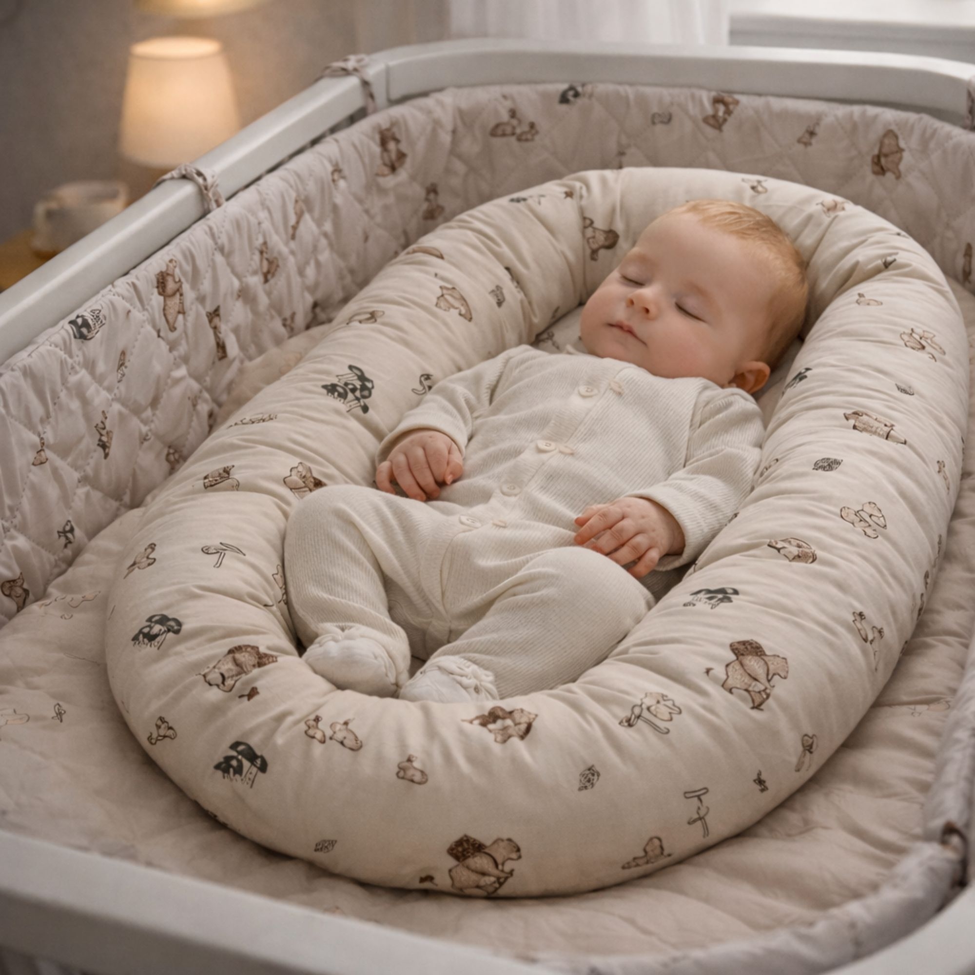 Behagelig og trygt babynest 82x46 cm i sandfarvet med skovens dyr