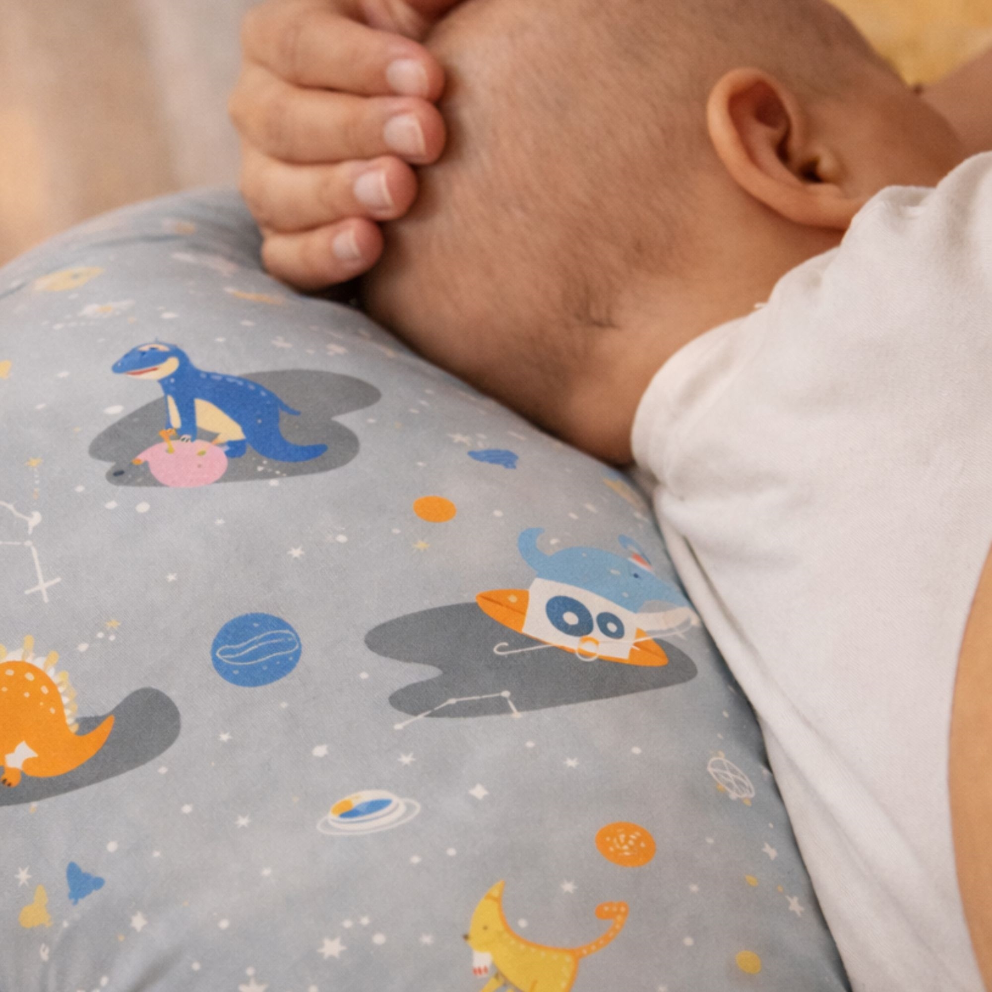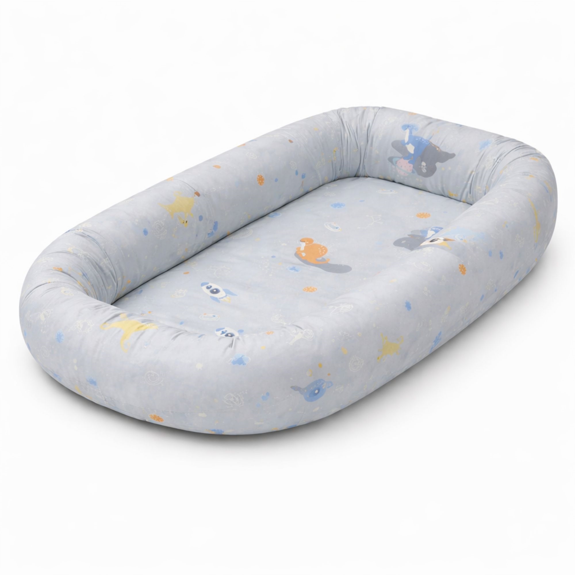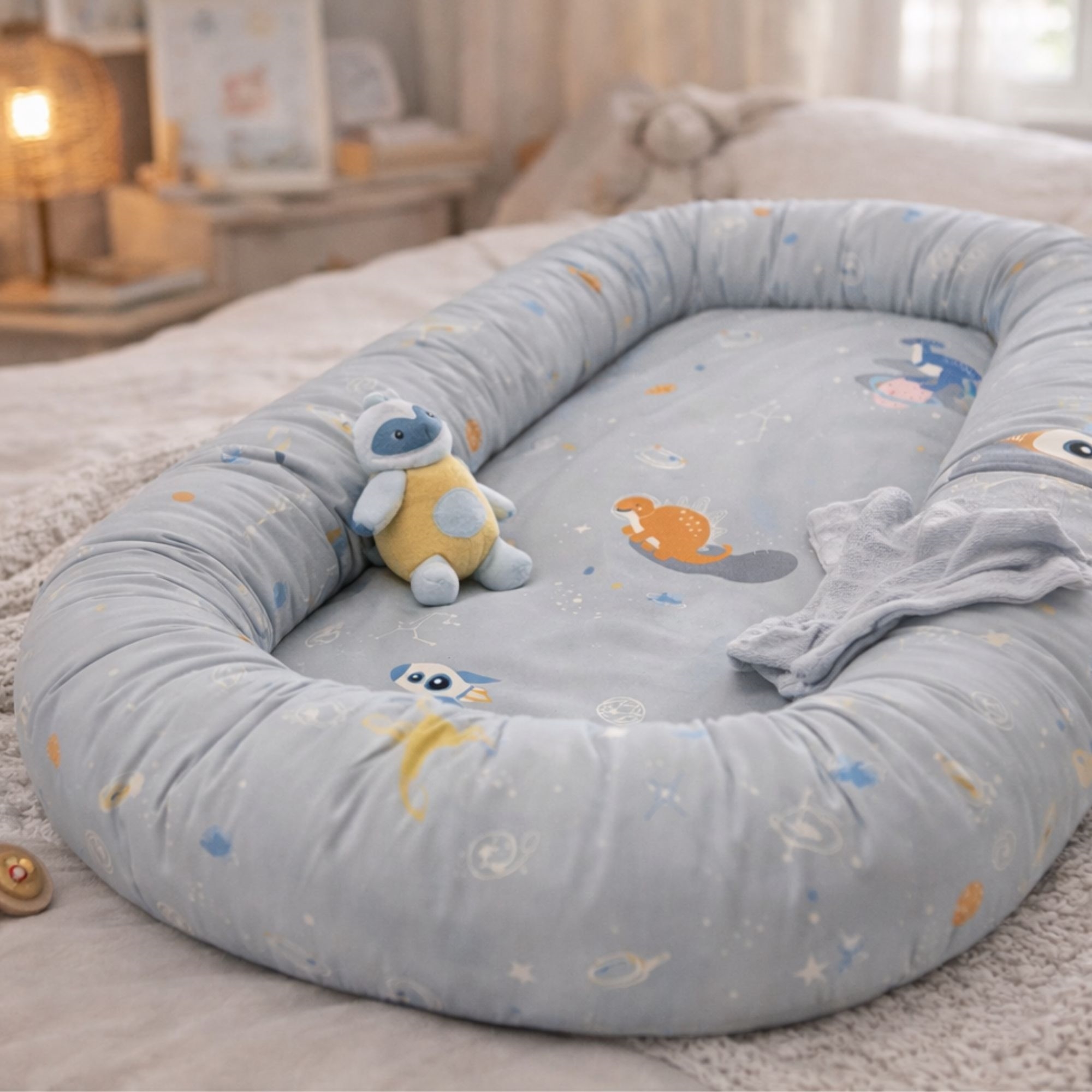 Behagelig og tryg babynest 86x46 cm i grå med rum dinosaur