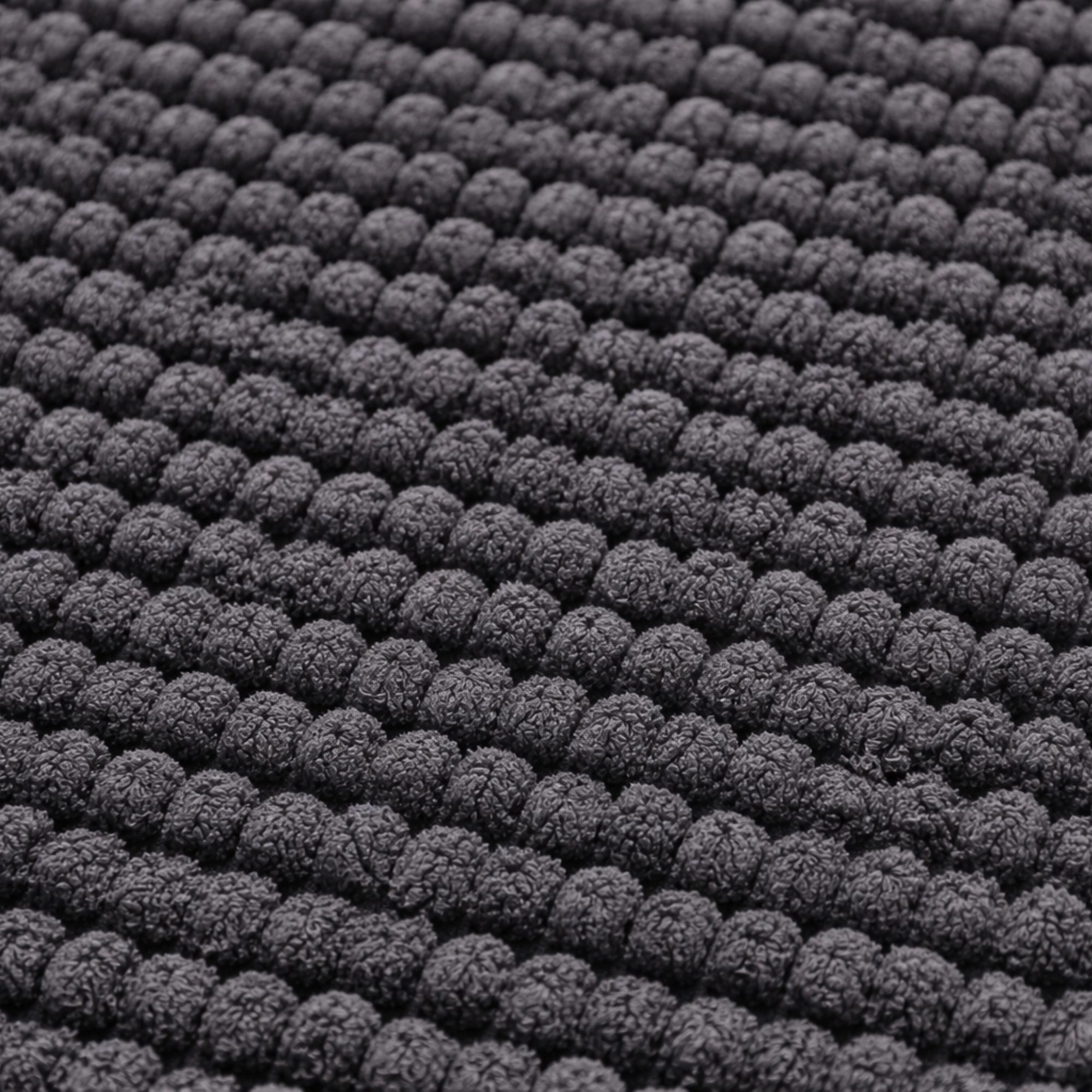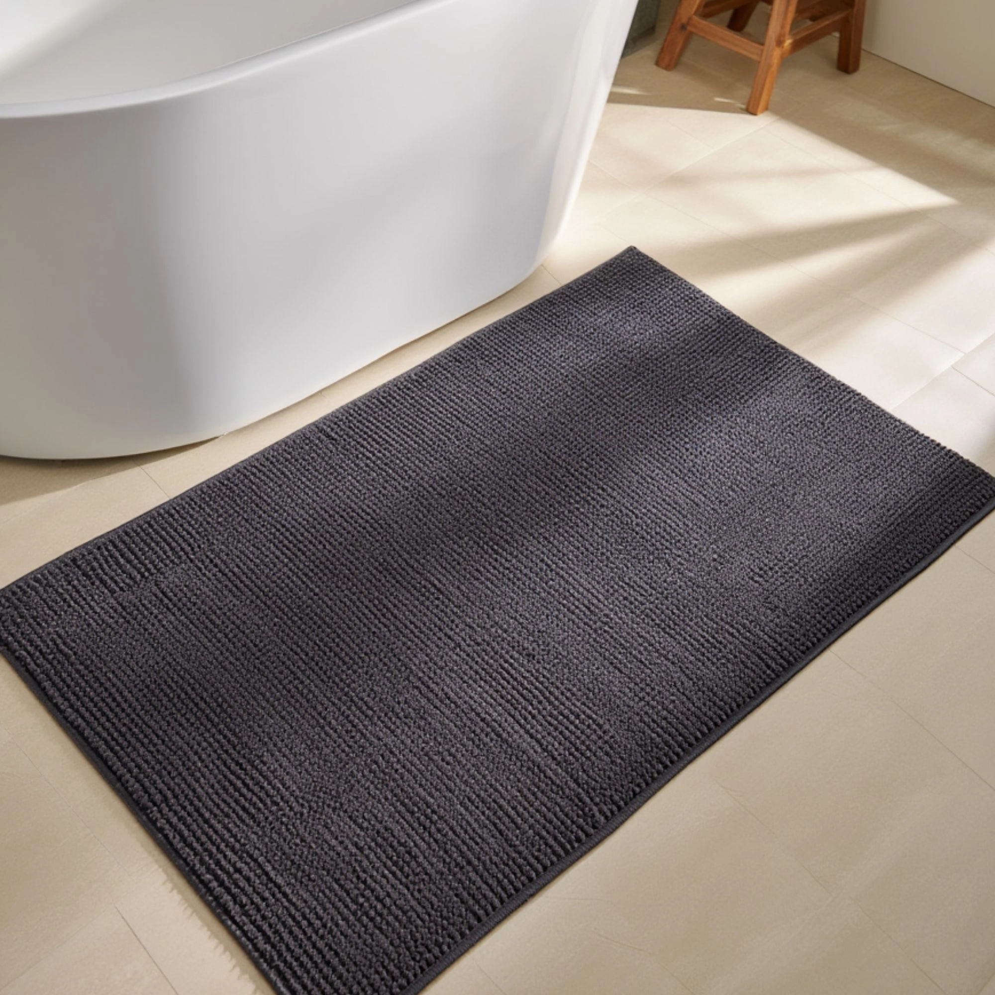 Giv dit badeværelse et stilrent og moderne løft med denne elegante bademåtte i klassisk mørkegrå. Den enkle farve skaber et roligt udtryk og passer perfekt ind i både lyse og mørke badeværelser. Den bløde overflade i 100% polyester føles behagelig under fødderne og giver en komfortabel start på dagen. Samtidig absorberer måtten fugt effektivt og hjælper med at holde gulvet tørt efter badet. Bademåtten er perfekt til hverdagen - den slidstærke kvalitet gør den modstandsdygtig over for gentagen brug og vask, så den bevarer både form og udseende over tid. Den skridsikre bagside i SEBS sikrer, at måtten ligger stabilt på gulvet og giver ekstra tryghed i badeværelset. En praktisk og stilfuld løsning, der kombinerer komfort, funktion og holdbarhed i én.