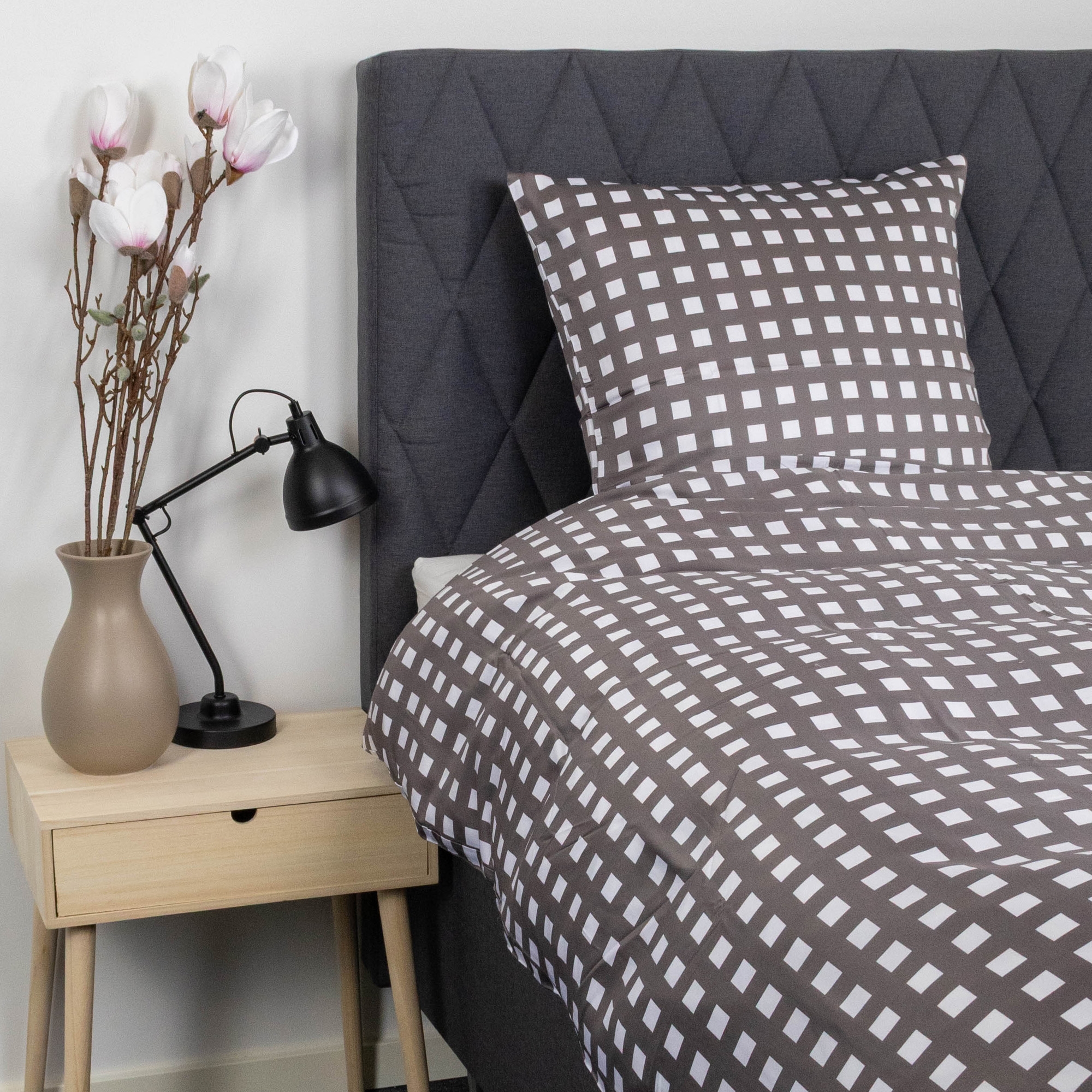 Bambus sengetøj med grå tern