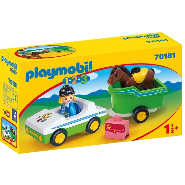 Forside » Legetøj » Playmobil » Alle PLAYMOBIL produkter Bil med hestetrailer - PL70181 - PLAYMOBIL 1.2.3 Playmobil 123 Skarp pris: 199,00DKK Få på lager Trustpilot Antal Læg i kurv Se mere fra: Playmobil 123 Artikelnummer: LEGPL70181 Har du spørgsmål til produktet? Rytteren vil gerne køre til næste turnering med sin hest De har allerede trænet i flere uger. Nu er dagen endelig kommet. Sæt forsigtigt hesten ind i anhængeren, og luk bagklappen. Rytteren stiger glad ind i bilen og kører af sted. Det bliver en spændende dag. Legesættet består af en bil med hestetrailer, en PLAYMOBIL-1.2.3-figur, en hest og en kuffert. x Tilbage til Alle PLAYMOBIL produkter