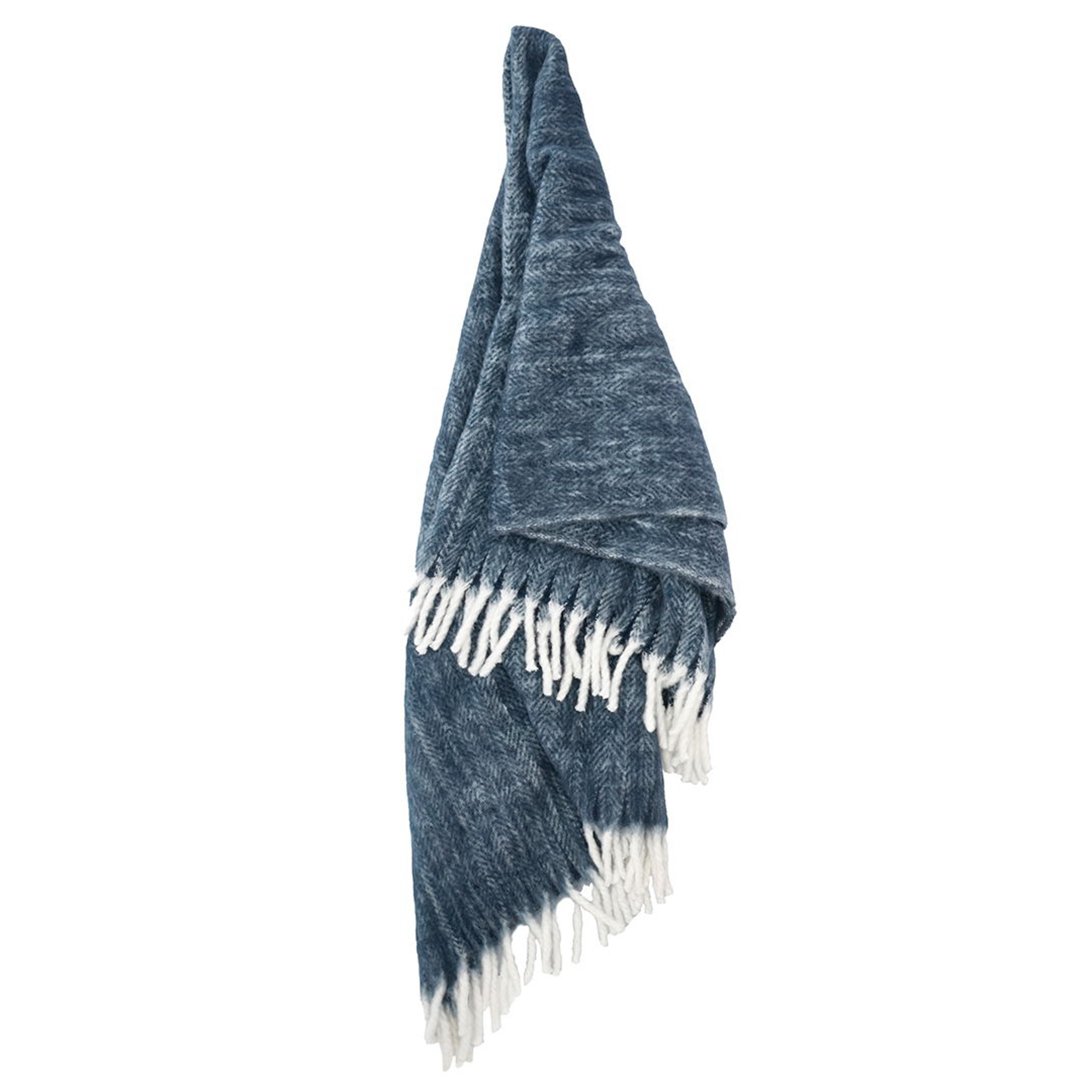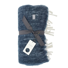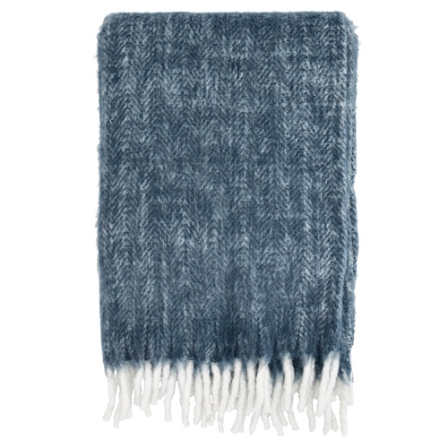 Strikmønstret er et traditionelt, tidløst sildebensmønster. Tæppet er af akryl og ekstra stort, 150 x 200 cm, med lange, tykke frynser i begge ender.