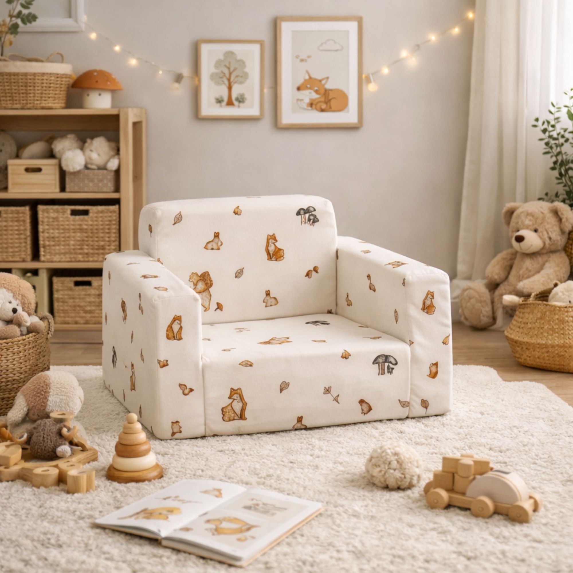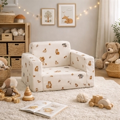 Giv dit barn sit helt eget hyggelige sted med denne praktiske og komfortable børnefoldestol fra Nordstrand Home. Den smarte 2-i-1 løsning fungerer både som en blød børnestol og kan nemt foldes ud til en lille madras – perfekt til afslapning, højtlæsning, filmhygge og små middagslure.