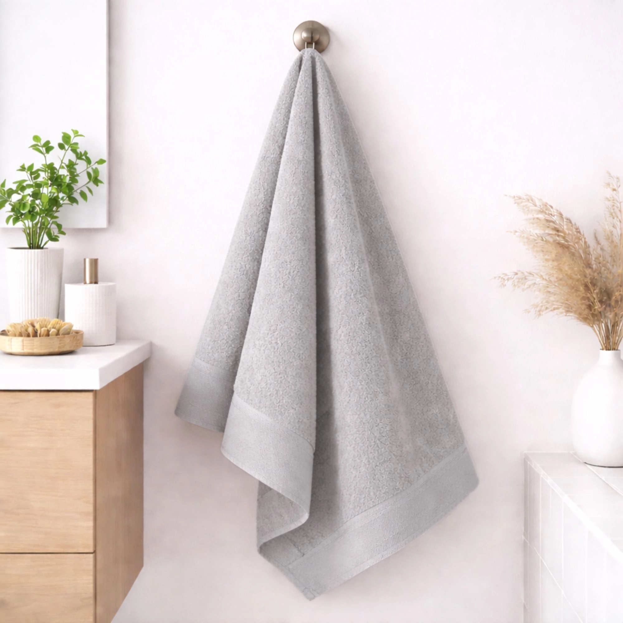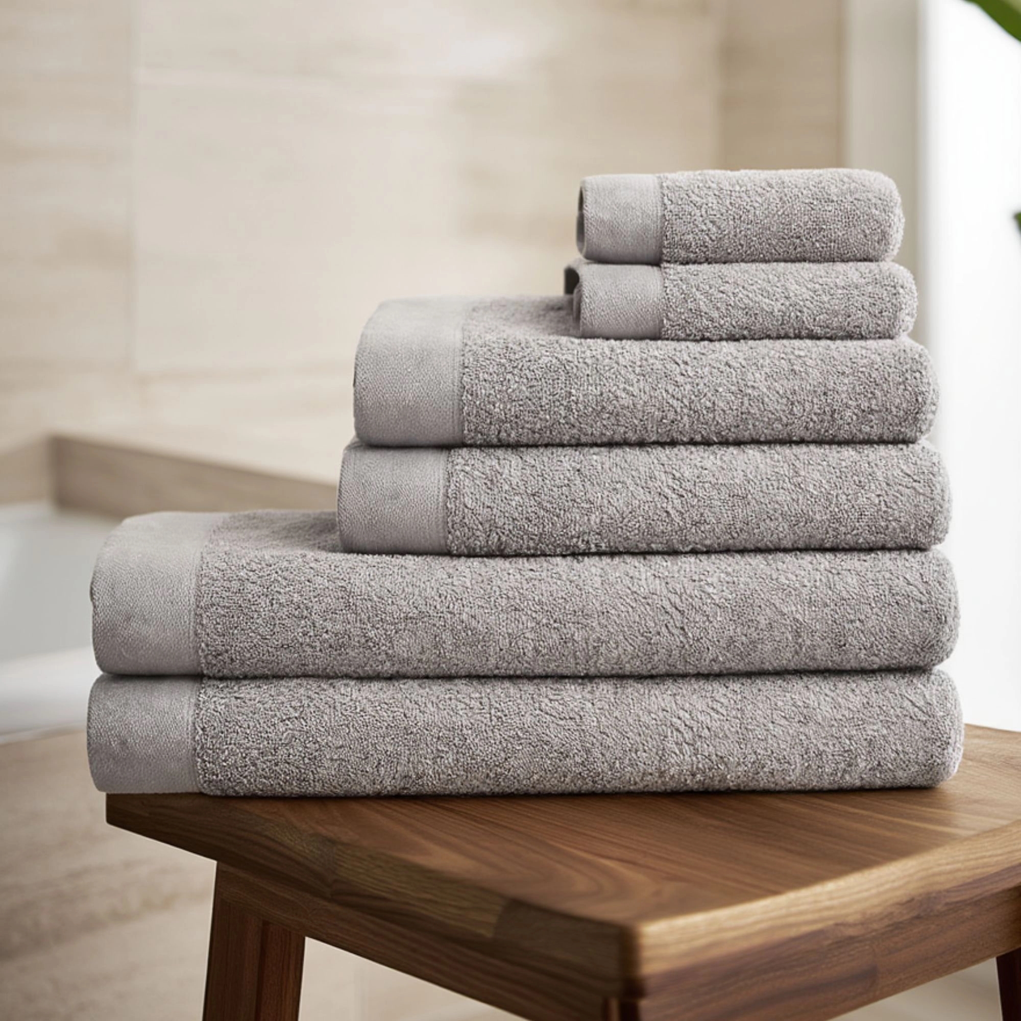Forkæl dit badeværelse med dette elegante håndklædesæt fra By Borg. Med denne 6-pak får du både funktionalitet og stil samlet i ét - perfekt til dig, der ønsker en flot og indbydende indretning. Denne 6-pak 6 består af 2 stk. 40x60 cm gæstehåndklæder, 2 stk. 50x100 cm håndklæder og 2 stk. 70x140 cm badehåndklæder. Håndklæderne er fremstillet i 100% bomuld, hvilket giver en blød og behagelig overflade, der føles skøn mod huden efter badet. Den praktiske ophængsstrop gør det nemt at hænge håndklædet op, så det altid er klar til brug. Et oplagt valg til dig, der ønsker bløde, slidstærke og stilfulde håndklæder i hverdagen.