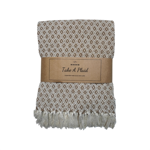 Skab en hyggelig og stilfuld stemning i dit hjem med denne smukke bomulds plaid fra Take a plaid. Plaiden er fremstillet i 100% recycled bomuld, hvilket gør den både blød, komfortabel og til et mere bæredygtigt valg.