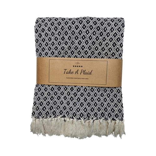 Skab en hyggelig og stilfuld stemning i dit hjem med denne smukke bomulds plaid fra Take a plaid. Plaiden er fremstillet i 100% recycled bomuld, hvilket gør den både blød, komfortabel og til et mere bæredygtigt valg.