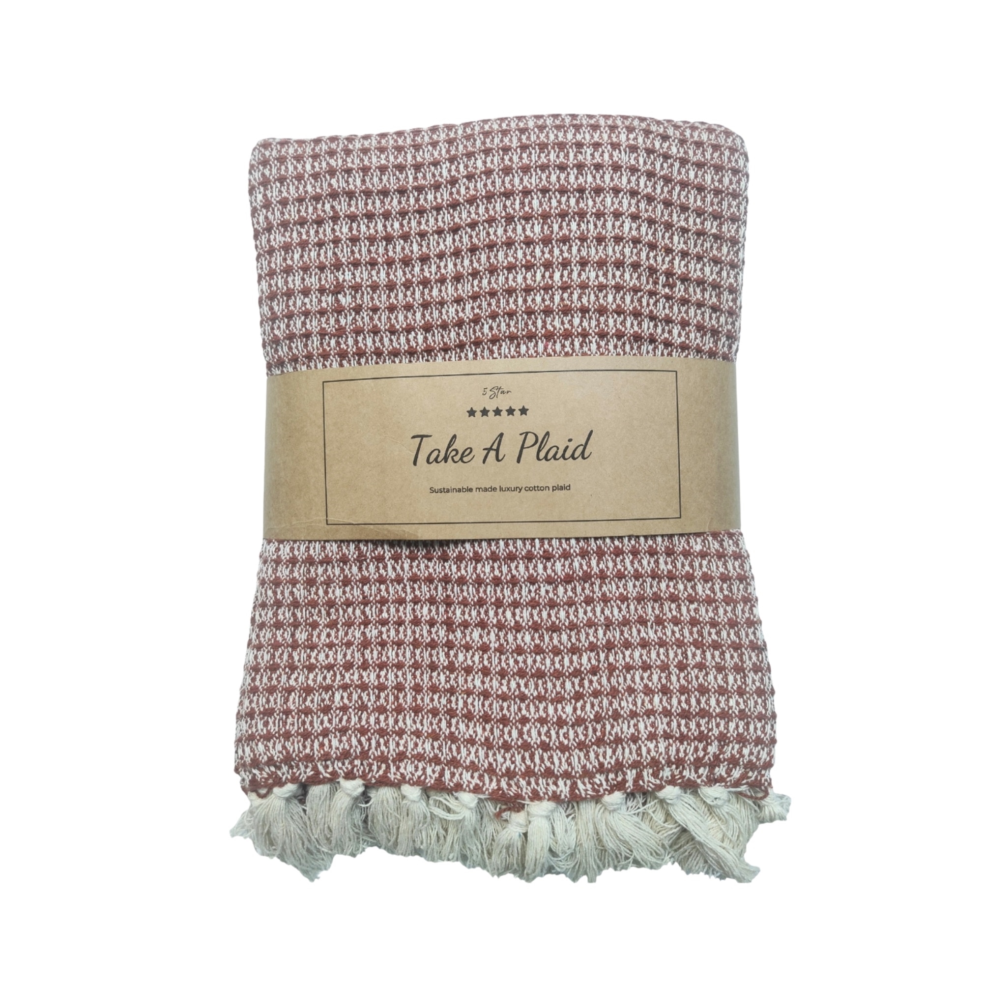 Skab en hyggelig og stilfuld stemning i dit hjem med denne smukke bomulds plaid fra Take a plaid. Plaiden er fremstillet i 100% recycled bomuld, hvilket gør den både blød, komfortabel og til et mere bæredygtigt valg.