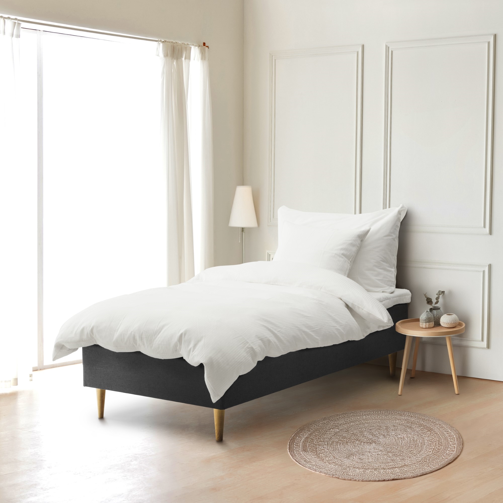 Forside » Senge » Boxmadrasser Boxmadras 80x200 cm - Prestige - 2 komfort lag - Inkl. topmadras og ben - Ekstra god støtte Fås i flere farver Spar57% Nordstrand Home Lev.: 1-5 hverdage På lager Trustpilot Vælg farve Antal Lys grå (0,00) Grå (0,00) Sand (0,00) Vælg topmadras Naturlatex topmadras - 80x200 cm - 7 cm høj -... (1.400,00) Topmadras - 80x200 cm 5 cm høj - NASA Memorys... (300,00) Topmadras 80x200 cm - Basis purskum topmadras... (0,00) Topmadras - 80x200 cm 5 cm høj - NASA Memory ... (250,00) Vælg ben Metal ben til madrasser - 18 cm - Ben til sen... (0,00) Metal ben til madrasser - 23 cm - Ben til sen... (100,00) Metal ben til madrasser - 18 cm - Champagne f... (200,00) Sorte ben til madrasser - 15 cm - Sorte ben t... (100,00) Sorte ben til madrasser - 20 cm - Sorte ben t... (200,00) Træ ben til madrasser - 15 cm - Træ ben til s... (200,00) Træ ben til madrasser - 20 cm - Træ ben til s... (200,00) Vælg rullemadras Ingen Temperaturregulerende rullemadras - 80x200 cm... (399,00) Levering Levering til kantsten (0,00) Boxmadras 80x200 cm - Prestige - 2 komfort lag - Inkl. topmadras og ben - Ekstra god støtte DKK Se mere fra: Nordstrand Home Artikelnummer: PR-BOX-80 Læs vores sengeguide Se vores store udvalg af rullemadrasser 80x200 Se vores store udvalg af topmadrasser 80x200 Har du spørgsmål til produktet? Base med 2 lags fjedring Ekstra god støtte Komplet seng inkl. topmadras 110 dages gratis prøveperiode Levering: 1-2 hverdage – mulighed for selv at vælge leveringsdato Størrelse: 80x200 cm Type: Boxmadras - 2 lag Model: Prestige Fasthed: Medium Betræk: Slidstærkt møbelbetræk Betræk slidstyrke: 50.000 martindale Farve: Valgfrit Fjedertype: Pocketfjedre Fjedre/m2: 253 stk Fjedertype: Bonellfjedre Fjedre/m2: 105 stk Basens højde: 30 cm Ben: Stålben 18 cm - Tilvalg muligt Topmadras højde: 4 cm - Tilvalg muligt Total højde uden ben: 34 cm Total højde med 18 cm. ben: 52 cm Certificering: STANDARD 100 by OEKO-TEX® Brand: Nordstrand Home Garanti: 10 års garanti på stel og fjedre Prestige: Komplet boxmadras i 2 lag - med både bonell- og pocketfjedre. Sengen kommer inkl. sengeben og 4 cm. topmadras Se alle vores boxmadrasser i 80x200 cm her Hvad er en boxmadras? Boxmadrasser er en enkel og prisvenlig sengeløsning. Selve madrassen er indbygget i en solid træramme beklædt med stof. Skal blot påsættes sengeben for at være klar til brug. Prestige boxmadras Boxmadrassen: Vores Prestige boxmadras i 2 lag med både bonell- og pocketfjedre som giver ekstra god støtte. Pocket fjedre er kendt for deres individuelle støtte og trykaflastning, mens bonellfjedre er mere åbne og har en naturlig bounce. Ved at kombinere begge typer fjedre kan man opnå en ekstra god balance mellem støtte og komfort. Topmadrassen: En standard 4 cm purskums topmadras, med aftageligt og vaskbart betræk. Komplet seng - hvad følger med: Topmadras 4 cm - Andre tilvalg mulige Boxmadras 30 cm Standard ben 18 cm - Andre tilvalg mulige Tilkøb: Sengegavl Fjedring Bonellfjedre – Elastisk og fast komfort med en naturlig bounce. Pocket fjedre – Individuelt indpakkede fjedre, der giver målrettet støtte. Ønsker du ekstra luksus? Opgrader din boxmadras med en springmadras oplev følesen af luksus og vil være oplagt til dig der ønsker en ergonomisk seng. Med en springmadras har du mulighed for at kombinere din seng så den passer præcis til dine behov og ønsker. En springmadras placeres normalt på et sengestel eller en solid base som f.eks. direkte oven på din boxmadras. Se alle vores springmadrasser her Se alle vores kontinentalsenge her Topmadras – For ekstra komfort En topmadras beskytter din madras og forbedrer din komfort. De mest populære valg: Memoryskum topmadras – Former sig efter kroppen og reducerer trykpunkter. Latex topmadras – Åndbar og elastisk, perfekt til varme nætter. Kølende gel topmadras – Holder dig frisk og komfortabel hele natten. Anbefalinger: Se alle vores topmadrasser her Anbefaling Vi anbefaler altid at anvende en rullemadras ovenpå den faste madras/topmadras. En rullemadras fungerer som en beskyttende barriere mellem dig og madrassen. Ved at beskytte madrassen mod urenheder og slidtage, forlænger du madrassens levetid. Vedligeholdelse af din seng Vend din madras regelmæssigt for at sikre jævn slitage. Brug en rullemadras for at beskytte din madras mod sved og snavs. Støvsug din seng jævnligt for at reducere støvmider og allergener. 110 dages prøveperiode på senge Hos HOME-TEX kan du trygt købe din nye seng med 110 dages prøveperiode. Vi ved, at det tager tid at vænne sig til en ny seng, og derfor får du muligheden for at teste den hjemme i rolige omgivelser. Prøv sengen i op til 110 dage Returnér, hvis den ikke passer til dig Nemt & enkelt – vi hjælper dig hele vejen Hvis du ikke er tilfreds med din nye seng, kan du returnere den igen. Vi ønsker, at du får den bedste nattesøvn – og det kræver den rette seng! Med Nordstrand Home er du sikret boligtekstiler i dansk design - i nordisk stil. Nordstrand Home lægger stor vægt på følelsen af velvære i et flot, men samtidig, afslappende miljø. Med Nordstrand Home behøver du ikke gå på kompromis, du finder altid produkter i klassiske og moderigtige farver. Nordstrand Home – Så føler du dig hjemme! Tilbage til Boxmadrasser