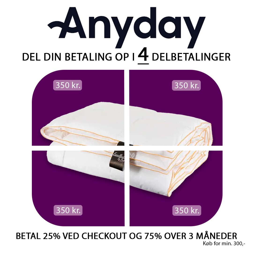 Del din betaling op med Anyday Med Anyday kan du nemt, hurtigt og sikkert dele din betaling op i 4 mindre rater, så du undgår at skulle af med hele beløbet på én gang. Dit køb vil blive godkendt eller afvist med samme hastighed, som når du normalt betaler online, og er super nemt at benytte sig af. For at kunne bruge Anyday, kræver det at du køber for min. 300,-. De 4 delbetalinger vil automatisk blive trukket på dit kort, og de første 25% vil blive trukket idét du aflægger en ordre. Betaler du til tiden, vil du kun betale produktets beløb, og du slipper for både renter og gebyr. Anyday er 100% sikkert at benytte, og gør processen nemmere for dig. ✅ Rentefrit Tilføj dine favoritter til kurven nu og vælg Anyday som betaling.✅ Gebyrfrit ✅ 100% sikkert Se Anyday's betingelser og vilkår her. |