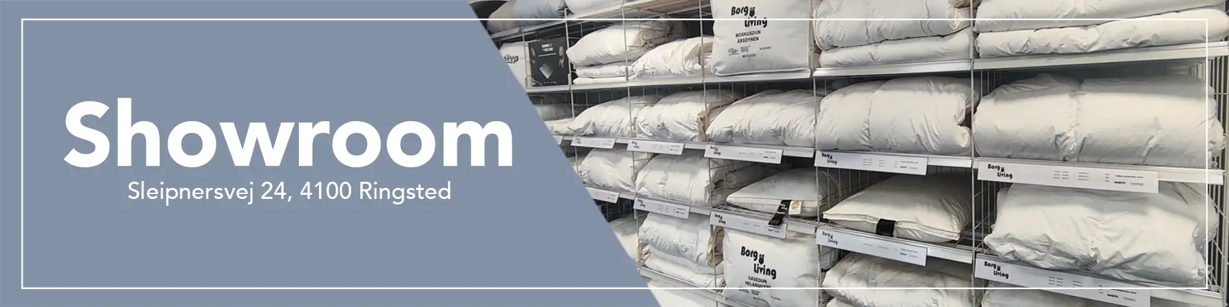 I vores showroom i Ringsted har vi et udvalg af vores lækre produkter udstillet. Her kan du komme og se, føle og blive vejledt i din søgen. Hvad end det drejer sig om dyner, puder, madrasser eller et helt fjerde produkt fra vores kæmpe udvalg – så står vi klar til at hjælpe dig.
