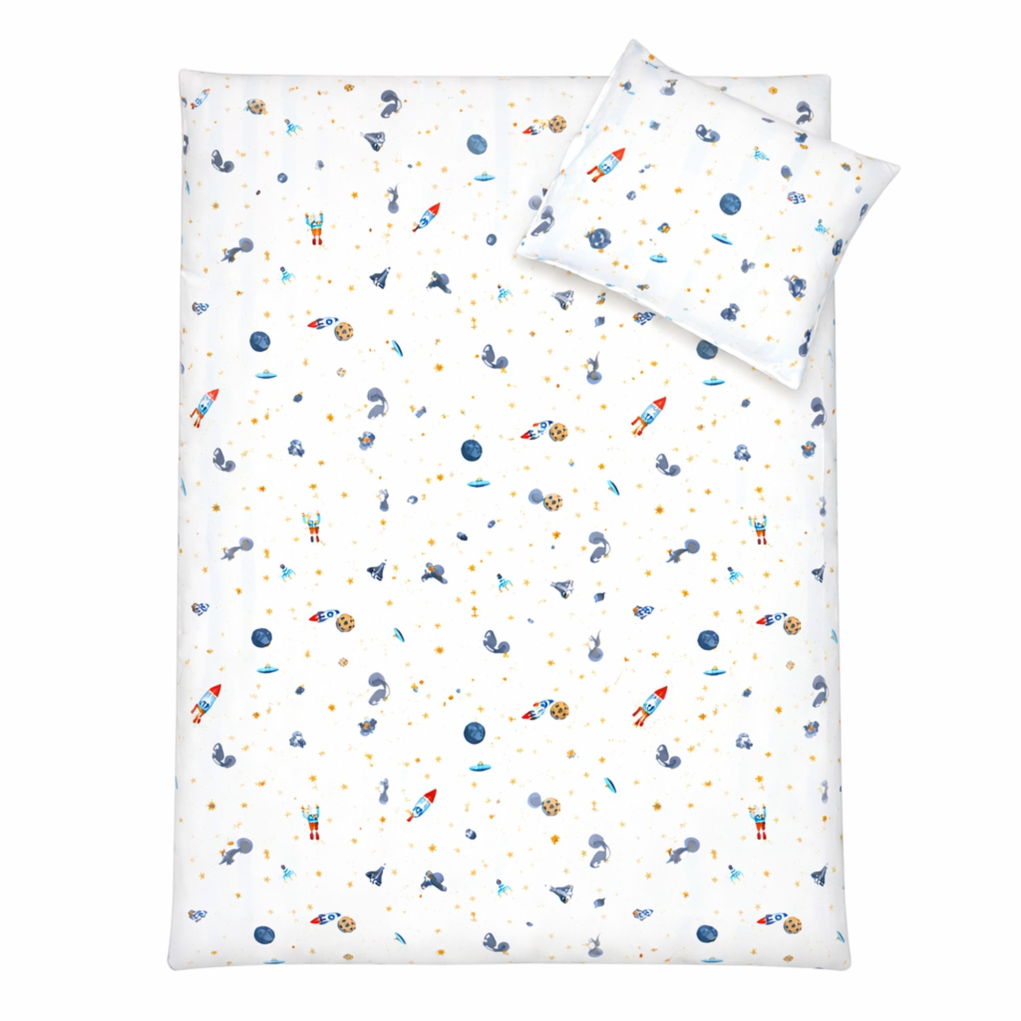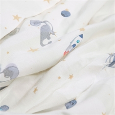 By Mats junior sengetøj 100x140 cm - hvidt stribet med dinosaurer og rumraketter