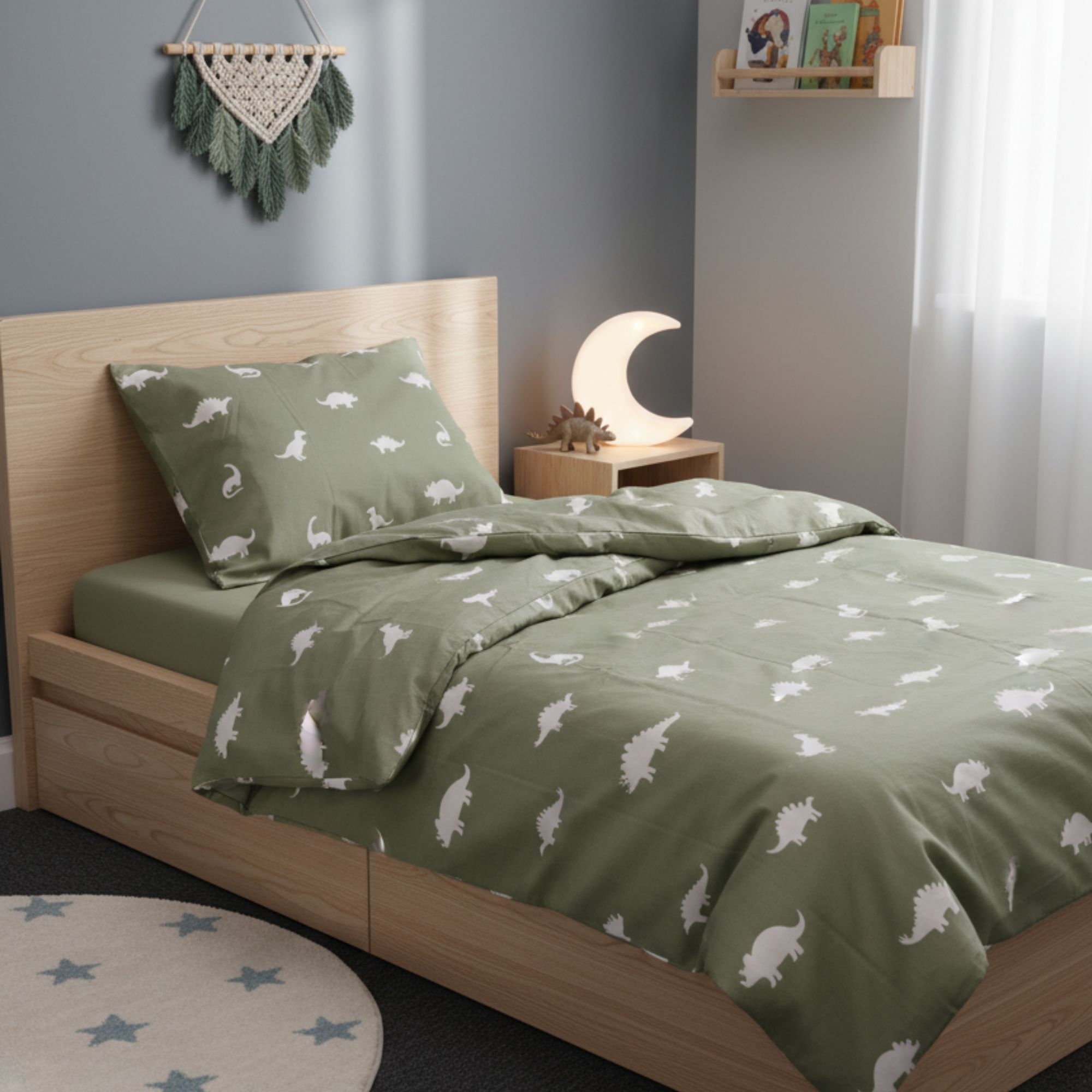Skab en rolig stemning på børneværelset med dette fine baby sengetøj fra By Mats i en grøn nuance med små, dekorative dinosaurer. Det enkle og nordiske design giver et blødt og harmonisk udtryk, som passer smukt ind i både moderne og klassiske indretninger.