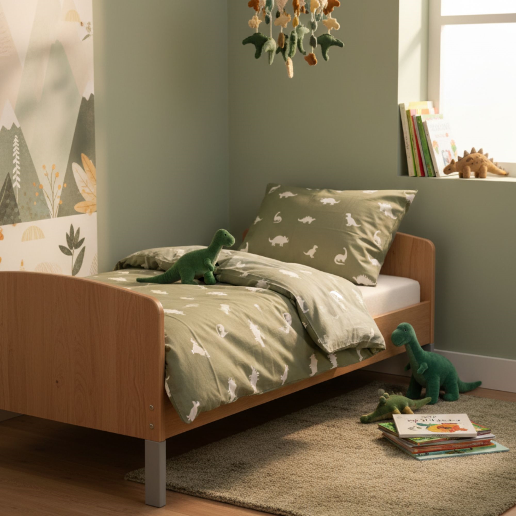 By Mats babysengetøj 70x100 cm - grønt med dinosaurer