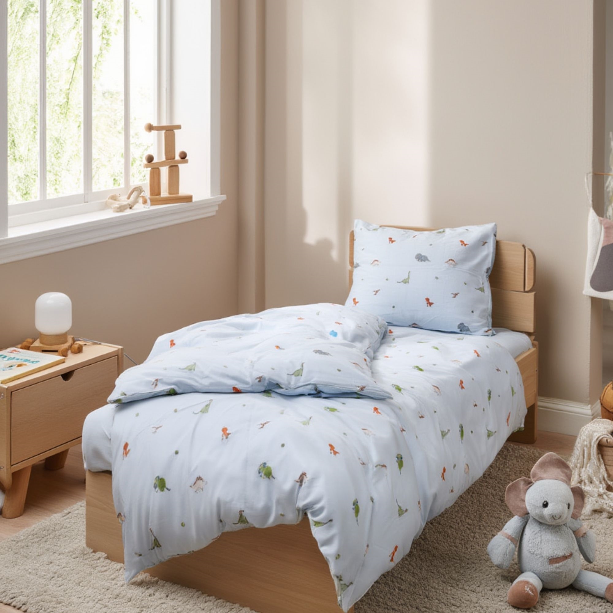 Sengesættet er fremstillet i 100% blød bomuld, som er åndbart og behageligt mod barnets hud. Bomuldens naturlige egenskaber hjælper med at regulere temperaturen i løbet af natten, så dit barn får en komfortabel og rolig søvn - året rundt.