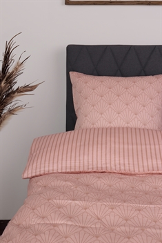 Skab en stemningsfuld og elegant atmosfære i soveværelset med dette smukke dobbelt sengesæt i 100% bomuldssatin. Sengetøjet kombinerer et grafisk mønster med et mere roligt stribet design på bagsiden, så du nemt kan skifte udtryk i soveværelset ved blot at vende sengetøjet.