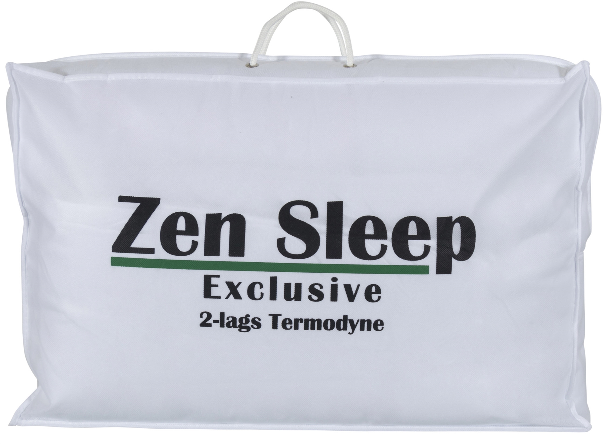 Zen Sleep Exclusive 2-lags dobbelt termodyne er en allergivenlig fiberdyne af en høj kvalitet. Den er perfekt til dig, som ønsker en varm, tungere dyne, der falder godt rundt om kroppen. Dynen er fyldt med microfibre der absorberer og transporterer fugten væk fra kroppen, således kan kroppen ånde og samtidig holde en konstant temperatur. Dynens microfiberfyld er fordelt i kassetter, hvor selve fibrene er fremstillet så de minder om de egenskaber man ellers kender fra en dundyne. Når dynen er kassettesyet sikrer man, at fibrene fordeler sig jævnt i dynen og isolerer uden kuldebroer. En af de mange fordele ved en fiberdyne er også, at den er utrolig nem at vedligeholde. Fiberdynen har en meget tæt konstruktion der gør at den tåler at blive vasket igen og igen. Dette sikrer dig en god, solid og hygiejnisk dyne, med en lang levetid.