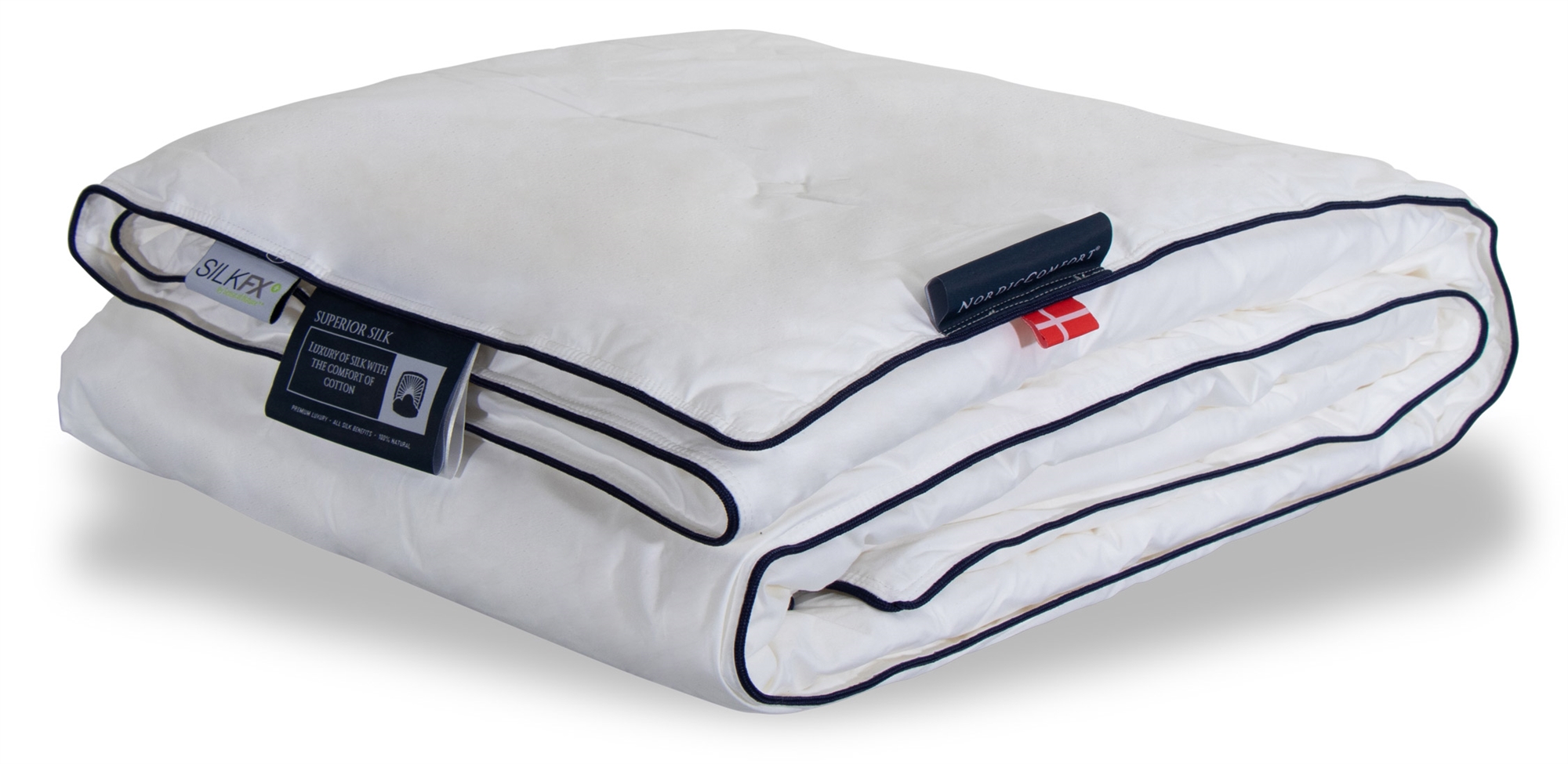 Forside » Dyner » Dyne type » Silke dyner Dobbeltdyne 240x220 cm - Silkedyne - Nordic Comfort - Vaskbar helårs dobbelt dyne med Langfibret silke Spar31% Nordic comfort 4.799,953.299,95DKKSpar 1.500,- Gratis fragt på denne vareFå på lager Trustpilot Vælg størrelse Vælg variant Antal Læg i kurv Se mere fra: Nordic comfort Artikelnummer: 6101 Læs vores dyneguide Læs om vedligeholdelse af dyner og puder Se vores store udvalg af puder Har du spørgsmål til produktet? Silkedyne - Superior silkFra: Nordic Comfort100% langfibret mulberry silke Størrelse: 240x220 cm - King size Dyne Type: Helårsdyne lun Brand: Nordic Comfort - Superior Silk Fyld: Langfibret mulberry silke Silketæthed: 275 g m2 Fyldvægt: 1450 g Bolster: Blødt Eksklusivt tætvævet bomuldscambric Vask: Ja maskinvaskes (Vigtigt at anvende Enzymfrit vaskemiddel) Garanti: 10 år Leveres med eksklusiv bæretaske Certificering: STANDARD 100 by OEKO-TEX® (SHHO 090844) Certificering: Crossvent Silk FX Silkedynen er lavet af SilkFX, som er langfibret Mulberry silkefyld og med 100 % bomuldscambric udenpå. Våren af bomuldscambric gør, at dynen føles mere som en traditionel dyne og er tungere end f.eks. Silk Excellence dynen med silkevår. Superior Silk dynen er med SilkFX teknologi, så du nemt kan vaske dynen hjemme. Vi anbefaler Superior Silk dynen til dig, som gerne vil have en høj kvalitetsdyne med silkens gode egenskaber, samt for nemhedens skyld at kunne vaske den hjemme. Denne silkedyne har 10 års garanti. Nordic Comfort® er Danmarks mest solgte type sommer silkedyne! Det er der selvfølgelig en grund til. Evner: Luksuriøs silkefiber Oplev det ultimativ inden for sovemiljø Temperaturregulerende Forbedrer sund og dyb søvn som tilpasser sig din kropstemperatur Allergivenlig Afviser husstøvmider og allergener - mindre allergiske reaktioner Antibakteriel Renere og sundere sovemiljø Fugtabsorberende Reducerer nattesved og fugtigt sovemiljø Åndbar Lader din krop ånde naturligt og reducerer natlige overophedning Nordens mest solgte silkeprodukter er fra Nordic Comfort. Brandet er stiftet i 2007, og har til formål at producere et lækkert silkesortiment i allerhøjeste kvalitet til forbrugeren. Så du med hjælp fra deres søvneksperter, kan opnå en optimal og forbedret nattesøvn. Tilbage til Silke dyner