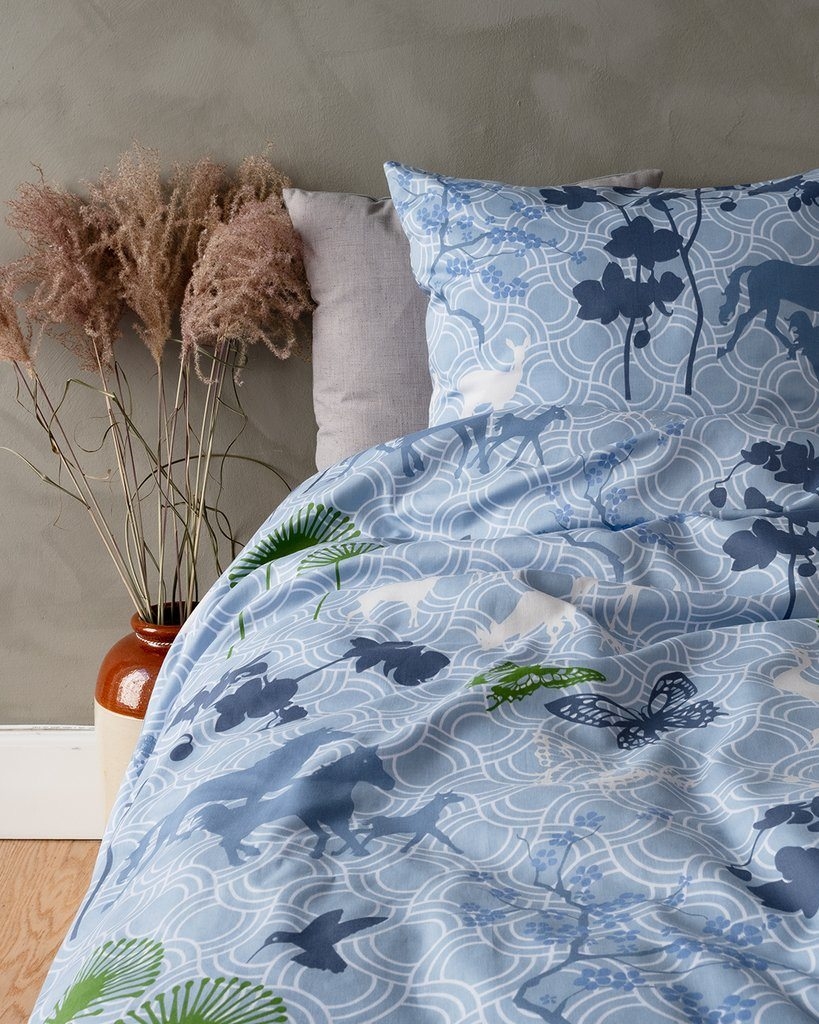 Forside » Sengetøj » Dobbelt sengetøj » Dobbelt sengetøj 200x200 cm Dobbeltdyne sengetøj 200x200 cm - Happy Horses blue - Sengesæt i 100% Bomuldssatin - Susanne Schjerning sengetøj 2 x PudebetrækSpar13% Susanne Schjerning 1.499,951.299,95DKKSpar 200,- Gratis fragt på denne vareFå på lager Trustpilot Antal Læg i kurv Se mere fra: Susanne Schjerning Artikelnummer: 2012-4 Læs vores sengetøjsguide Se vores store udvalg af lagner Se vores store udvalg af dyner 200x200 Har du spørgsmål til produktet? Sengetøj - 200x200 cm100% bomuldssatinSusanne Schjerning - Happy Horses Dynebetræk: 200x200 cm Pudebetræk: 2 stk. á 60x63 cm Materiale: 100% bomuld Vævning: Ekstra fin 300TC satinævning (Thread count = antal tråde pr. kvadrat tomme) Farve: Blå Design: Blåt med heste og planter Brand: Susanne Schjerning Lukning: Dyne- og pudebetræk med lynlås Vask: 60° Tørretumbling: Ja Tåler strygning: Ja Certificering: STANDARD 100 by OEKO-TEX® ( CCA 19180) Certificering: Sengetøjet er super soft easy-care behandlet, samt anti-peeling behandlet (hvilket gør sengetøjet strygefrit) Notes by Susanne Schjerning sengetøj er fremstillet i 100% luksus bomuldssatin med en fin og tæt vævning i bløde merceriserede bomuldsgarner, hvilket giver sengesættet ekstra blødhed, samt rigtig god slidstyrke. Sengesættet er ligeledes Easy Care behandlet samt anti-peeling behandlet, hvilket vil sige at det ikke skal stryges efter vask. Køb let matchende pudebetræk til dine ekstra puder her Susanne er uddannet fra Danmarks Design Skole, Institut for Unika, med speciale i tekstil tryk. Susanne Schjerning har arbejdet som tekstildesigner siden 2003 indenfor feltet unika håndværk og mainstream design. Susanne Schjernings kollektioner handler om at der skal være plads til begejstring, spontanitet og et glimt i øjet, så du mærker livet -og hvordan det giver bedst værdi for dig. Frisk sengen og soveværelset op med et flot og lækkert sæt sengetøj som dette. Benyt samtidig muligheden for at sikre dig maximal sovekomfort, ved at tilføje et nyt blødt lagen af høj kvalitet. Du finder vores store sortiment af kvalitets lagner her Tilbage til Dobbelt sengetøj 200x200 cm