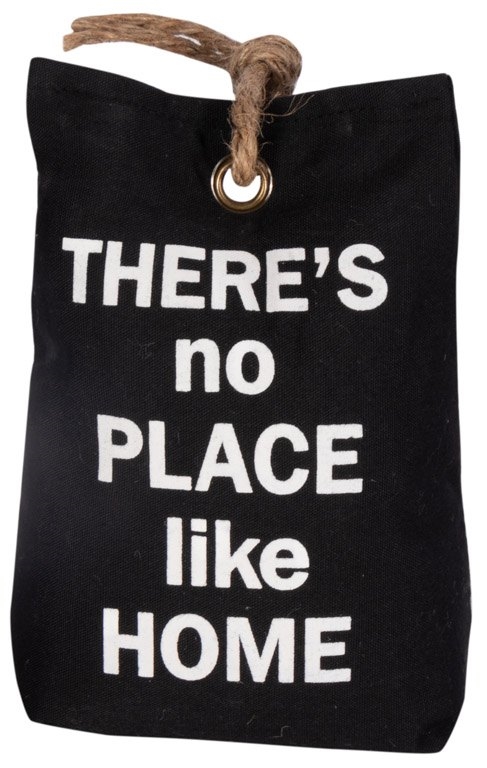 Denne flotte dørstopper er ikke kun praktisk, men også en attraktiv tilføjelse til dit hjem. Den er fremstillet af sort lærredsstof, fyldt med sand, og prydet med en fin tekst, der siger There's no place like home. Den kan også bruges som bogstøtte eller blot som dekoration i hjemmet.