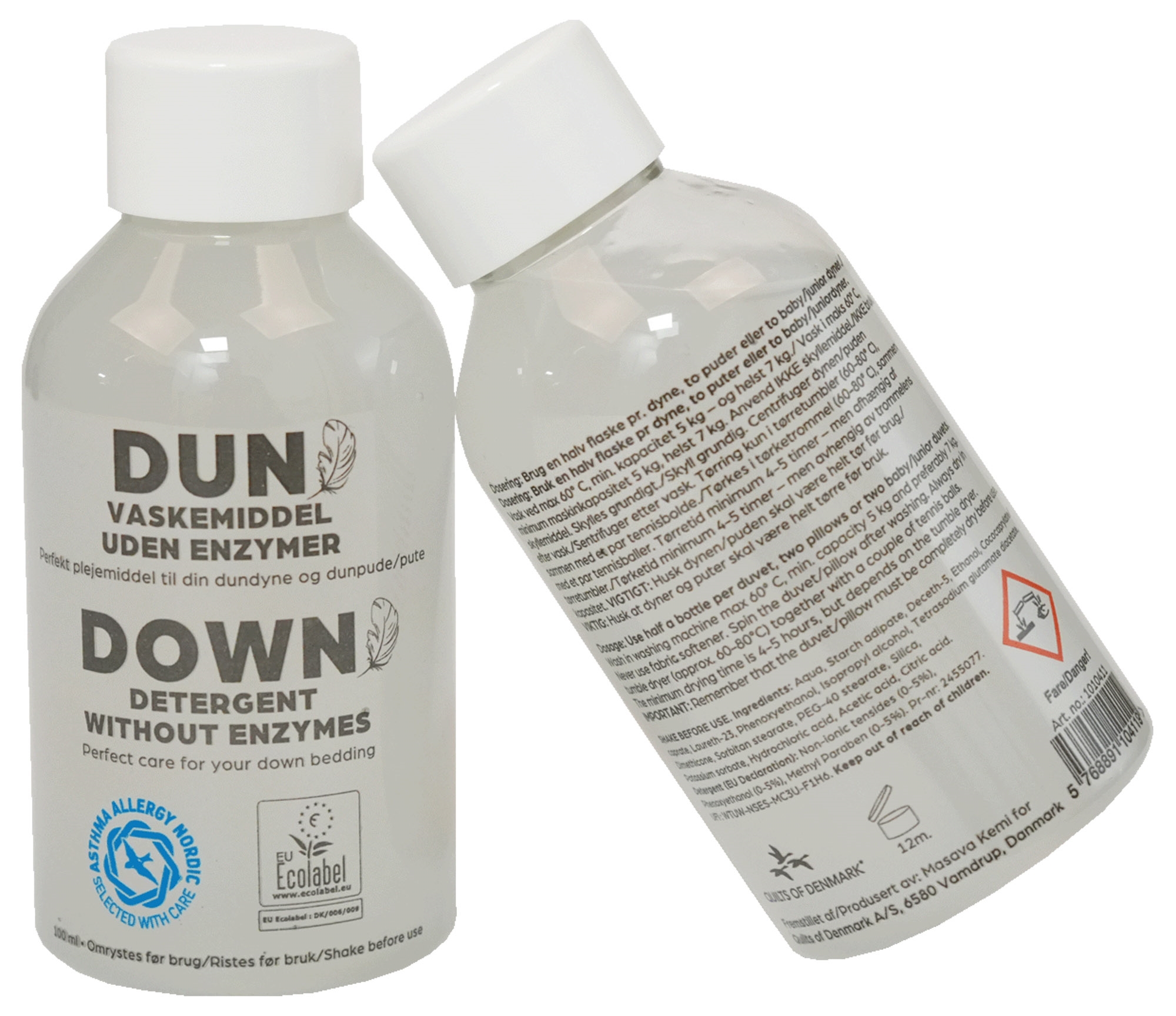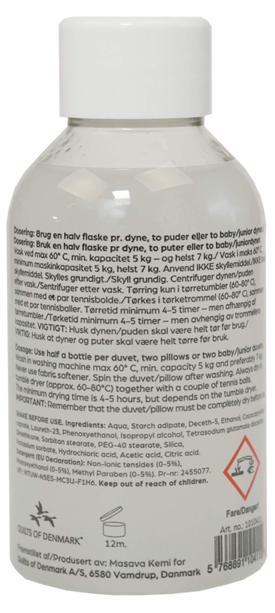 Forside » Dyner » Enkelt dyner » Enkelt dyne 140x200 cm Dun vaskemiddel til dyner og puder Spar6% Norvigroup 79,9574,95DKKSpar 5,- På lager Trustpilot Antal Læg i kurv Se mere fra: Norvigroup Artikelnummer: 39 Læs vores dyneguide Læs om vedligeholdelse af dyner og puder Se vores store udvalg af puder Har du spørgsmål til produktet? 100 ml dunshampooEnzymfrit vaskemiddelParfumefri Type: Enzymfrit vaskemiddel - dunshampoo Indhold: 100 ml Anvendelse: Kan bruges til alle produkter der skal vaskes på skånevask og/eller med enzymfrit vaskemiddel. Dosering: 50 ml. pr. dyne, to puder eller to baby/junior dyner. Produceret i: Danmark Brand: Quilt of Denmark Certificering: Asthma-Allergy Nordic Certificering: EU Ecolabel Vask af dun dyner og puder: Alle dun produkter er vaskbare på 60 grader i en normal vaskemaskine. Efter vask er det vigtigt, at dynen eller puden tørres grundigt i en tørretumbler, hvor der samtidig lægges 2-3 tennisbolde ind. Tennisboldene sikrer, at de filtrede dunboller, der måtte være kommet efter vask, frigøres og åbnes under tørrings processen. Vi anbefaler, at du vasker din hovedpude 1-2 gange årligt, og din dyne 1 gang årligt i forbindelse med skift mellem sommerdyne og vinterdyne. Vask af dunprodukt når du lider af allergi: Samme proces som beskrevet ovenfor anvendes, men blot oftere, hvis du vil være helt sikker på ikke at have husstøvmider i din seng. Det Europæiske Dun og Fjer Forbund (EDFA) anbefaler vask af dyner 4 gange årligt og vask af puder 12 gange årligt. Læs mere om vedligeholdelse af din dyne og pude Løbende vedligeholdelse: Ved hjælp af et par gode huskeråd kan du selv være med til at forlænge dynens levetid. Når du vågner om morgenen, er der stadig fugtighed tilbage i dynen/puden. Lad dem "dampe af", før du lægger sengetæppe på Luft dynen og puden regelmæssigt - undgå at støvsuge eller banke dem Vask dynen ( eller 2 hovedpuder ) alene i en vaskemaskine med en kapacitet på minimum 5 kg og helst 7 kg Har din dyne/pude behov for pletrensning, gøres det bedst med en hårdt opvredet svamp Brug et af de dunvaskemidler der findes på markedet, f.eks. Quilts of Denmarks specielt udviklede "DUNVASKEMIDDEL" Anvend altid et vaskemiddel uden enzymer. Vask på skåneprogram ved 60°C eller tilsvarende program med høj vandstand og lav tromlerotation Centrifuger dynen/puden efter vask. Vælg den mest skånsomme centrifugering Tørring må kun ske i tørretumbler. Temperaturen skal være ca. 60-80° C. Kom et par tennisbolde i tørretumbleren sammen med dynen/puden. Boldene sørger for, at fyldet holdes i bevægelse ved tørring og gør derfor tørringen mere effektiv Tørretiden bør være minimum 3-5 timer, men vil være afhængig af tørretumbleren. Det vigtigste er, at dynen/puden skal være helt tør - også de fine dun indeni, da de ellers "går i stykker". Tilbage til Enkelt dyne 140x200 cm