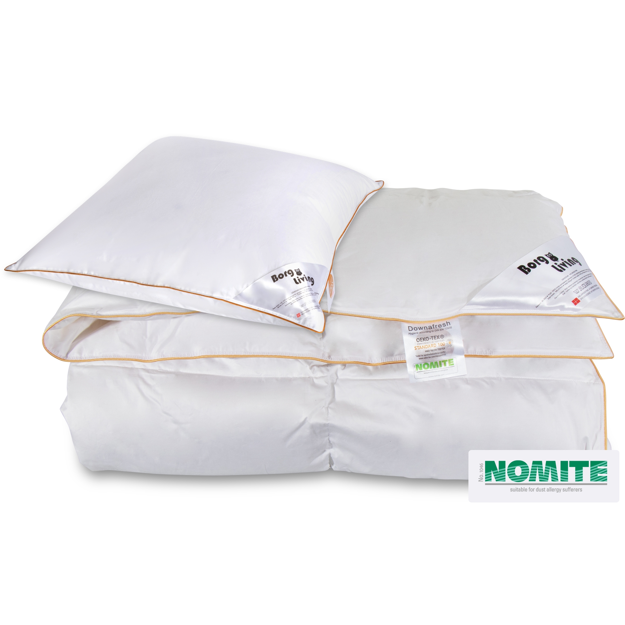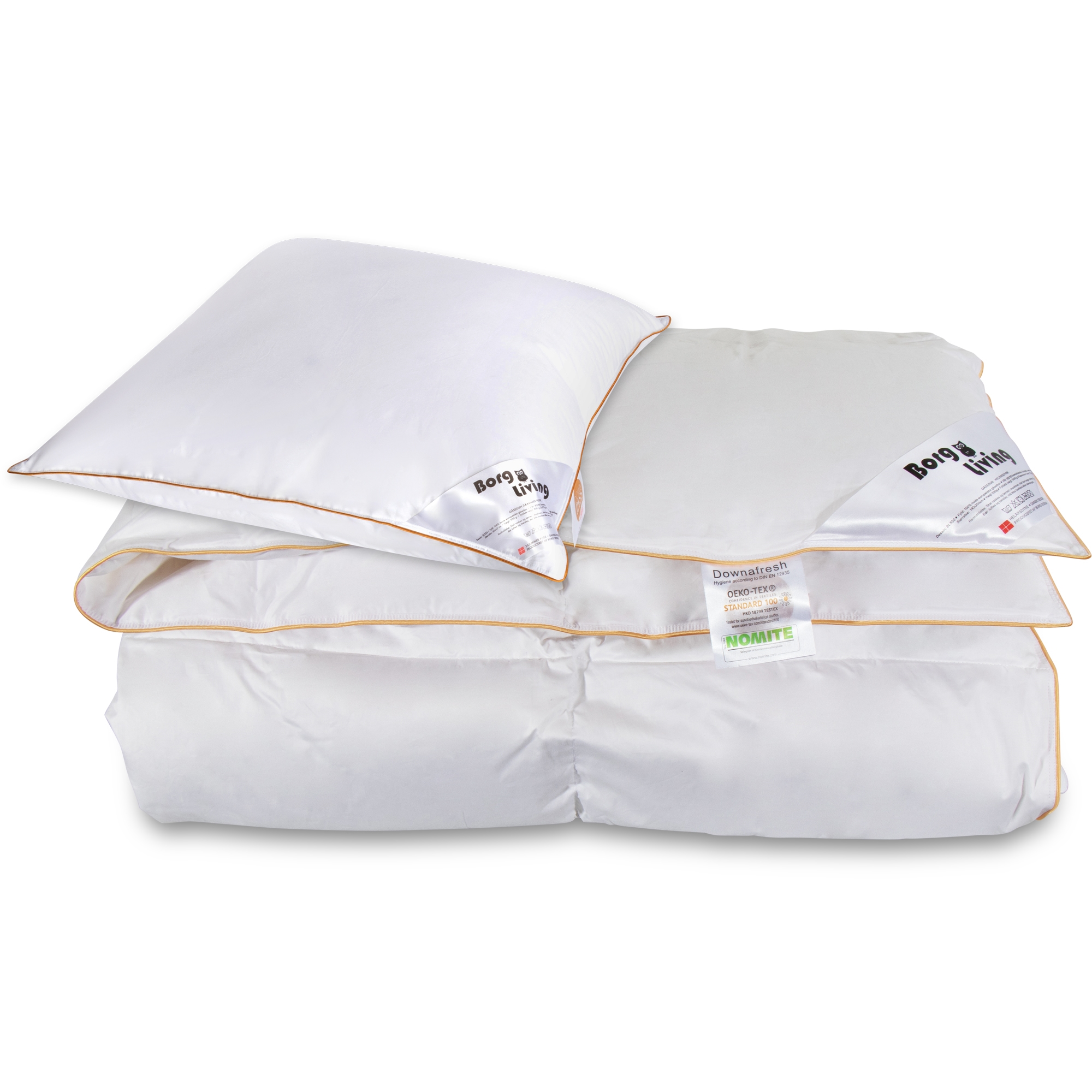 Forside » Dyner » Enkelt dyner » Enkelt dyne 140x200 cm Dynesæt tilbud med gåsedun - 1 Helårsdyne 140x200 cm & 1 pude 60x63 cm - Dyne og pudesæt - Borg Living gåsedunsdyne Dyne pudesæt Spar58% Borg Living 4.299,951.799,95DKKSpar 2.500,- Gratis fragt på denne varePå lager Trustpilot Antal Læg i kurv Se mere fra: Borg Living Artikelnummer: BL550-1xBL554 Læs vores dyneguide Læs om vedligeholdelse af dyner og puder Se vores store udvalg af puder Har du spørgsmål til produktet? Gåsedundyne sætDyne og pude 100% Europæiske gåsedun Dyne: Størrelse: 140x200 cm Type: Helårsdyne Fyld: 100 % Hvide og rene europæiske gåsedun Brand: Borg Living Fyldvægt: 500 g Bæreevne: Over 12 (Gammel målemetode) Bæreevne: 800 (Ny målemetode) Bolster: 100 % Bomuldssatin 80/80 (Ekstra fint og blødt) Konstruktion: 5x7 Kassettedyne med guld piping kant Garanti: 5 år Pude: Størrelse: 60x63 cm Type: Mellem hovedpude Konstruktion: 3 kammer gåsedunspude Brand: Borg Living Fyldvægt: 800g Yderkammer: 2x75g Fyld i kernen: 1x650g - Dun og småfjer Bæreevne: Over 10 (Gammel målemetode) 585 (Ny målemetode) Bolster: 100% bomuldssatin 80/80 (Ekstra fint og blødt) Garanti: 2 år Vask: 60° (Vigtigt at anvende Enzymfrit vaskemiddel) Tørretumbling: Skal tørretumbles med tørrebolde Certificering: STANDARD 100 by OEKO-TEX® (BEHO 062282) Certificering: Nomite - Fri for husstøvmider Certificering: Downafresh - 100% rene dun Certificering: Down pass - Højeste dyreetiske forhold Et lækkert dyne og pudesæt med 100% bløde gåsedun af højeste kvalitet. De bløde gåsedun er kendt for deres høje isoleringsevne og gode fylde. Dynen er en helårsdyne med 500g gåsedun med en bæreevne på over 12. Helårsdynen er konstrueret med kassetter som jævnt fordeler fyldet og derved sørger for en optimal isolering og temperatur på hele dynens flade. Bolstret er syet af 100% bomuldssatin i en tætvævning, som sørger for at gøre dynen duntæt og give en høj absorbering og ånding. Se vores store udvalg af sengetøj i 140x200 cm her Puden i dette dynepude sæt er en mellem højde pude. Hovedpuden er fyldt med bløde gåsedun, og betrukket med blødt og tæt bomuldssatin bolster. Gåsedunspuden er konstrueret med 3 kamre for en helt optimal støtte og komfort, hele natten igennem. Den mellem højde pude er gode til dig som hviler bedst på ryggen og på siden, eller oplever at vende dig ofte i søvne. Det danske brand Borg Living producerer eksklusive serier af dyner, puder og boligtekstiler til dit hjem. Brandet som er etableret i 2013 og er bl.a. kendt for deres nytænkning indenfor kvalitet og design. Borg Livings fantastiske produkter, bidrager til en optimal og behagelig nattesøvn samt udsmykker dit hjem med moderne og lækkert boligtilbehør. Tilbage til Enkelt dyne 140x200 cm Måske er du også interesseret i: Økologisk høj hovedpude - 60x63 cm - Gåsedunspude - 3 kamre hovedpude - Feng Shui svanemærket pudeSvanemærket Allergivenlig Nomite certificering Vejl. udsalgspris : 1.349,95 Spar : 300,00 1.349,95 DKK1.049,95 DKK Økologisk mellem/høj hovedpude - 60x63 cm - Gåsedunspude - 3 kamre hovedpude - Feng Shui svanemærket pudeSvanemærket Allergivenlig Nomite certificering Vejl. udsalgspris : 1.299,95 Spar : 300,00 1.299,95 DKK999,95 DKK