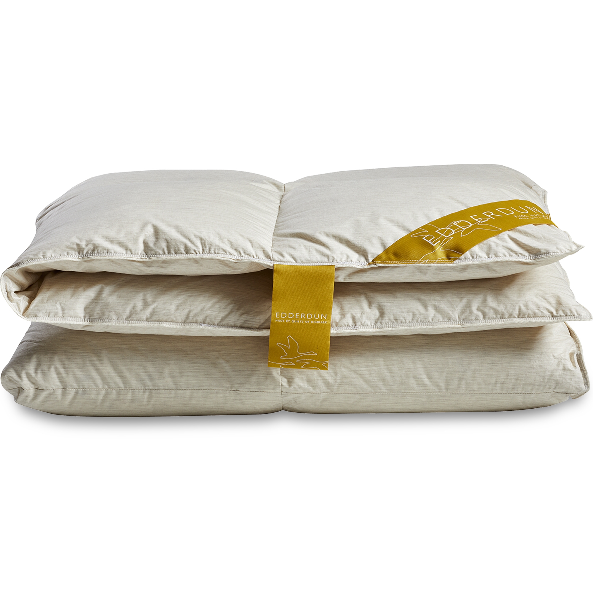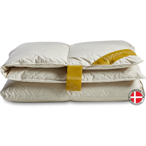 Denne luksus dyne består af 100% håndindsamlet islandske edderdun, den fineste, bedste og mest eksklusive duntype. Dunene bliver samlet direkte fra fuglens reder, så snart den efterlades af ungerne. De kostbare små dun har en unik isoleringsevne som når langt over andre almindelige dun, og så er de så lette - at de føles som varm luft. Edderdun er den dun type der har den højeste bæreevne/CUIN på 16/1100 - jo højere bæreevne, desto finere dun er der brugt. Edderdun er de fineste der findes, på verdensplan. Dette gør også de eksklusive dun til det letteste og varmeste materiale i hele verden. Edderdun griber, modsat andre duntyper, fast i hinanden så de ikke skilles ad, hvilket skaber deres utrolige isoleringsevne, samtidig med at de giver den letteste, mest luftige og fyldige dyne.