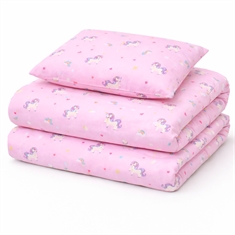 Sengesættet er fremstillet i 100% blød bomuld, som er åndbart og behageligt mod barnets hud. Bomuldens naturlige egenskaber hjælper med at regulere temperaturen i løbet af natten, så dit barn får en komfortabel og rolig søvn - året rundt.