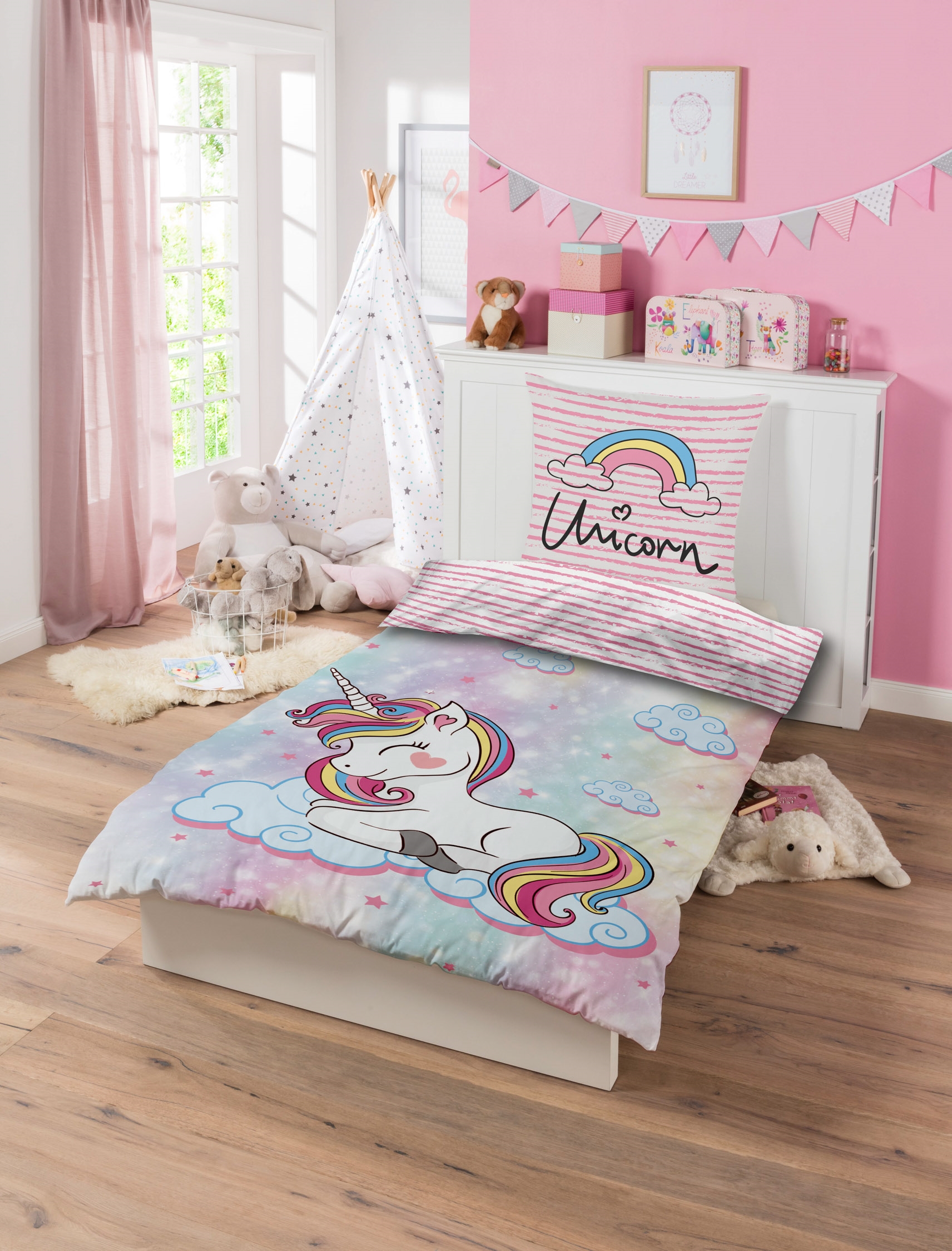 Forside » Licens sengetøj Enhjørning sengetøj - 150x210 cm - Sovende enhjørning på skyer - 100% bomulds sengesæt Licens 249,95DKK På lager Trustpilot Antal Læg i kurv Se mere fra: Licens Artikelnummer: L285-3 Læs vores sengetøjsguide Se vores store udvalg af lagner Se vores store udvalg af dyner 150x210 Har du spørgsmål til produktet? Sengetøj - unicorn100% bomuld150x210 cm Dynebetræk: 150x210 cm Pudebetræk: 50x60 cm Materiale: 100% bomuld Vævning: 200TC (Thread count = antal tråde pr. kvadrat tomme) Farve: Flerfarvet Motiv: Enhjørning sengetøj Lukning: Dyne med knapper og pudebetræk med overlap Vask: 60° Tørretumbling: Ja Tåler strygning: Ja Certificering: STANDARD 100 by OEKO-TEX® Virkelig sødt sengesæt med unicorn motiv. Forsiden viser en sovende enhjørning der svæver på en sky. Sengesættet er dobbeltface med forskellige farver/motiver for og bag. På dette sengesæt er bagsiden ensfarvet med lyserøde striber. Sengesættet er en oplagt gaveidé til dem der elsker de magiske enhjørninger. For barnet er sengen et trygt sted. Alle elementerne skal til sammen skabe skønne og dejlige omgivelser for barnet at finde ro i. Hos os kan du finde alt tilbehør til sengen, som er med til at skabe det rette sove miljø for dit barn. Her kan du finde lækre og bløde kvalitets lagner Tilbage til Licens sengetøj