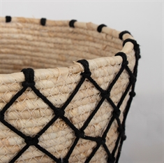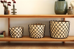 De sorte bomuldssnore, som dekorerer vores kurve, giver dem et moderne og karakteristisk udseende. Bomuld er berømt for sin blødhed og holdbarhed, hvilket sikrer, at kurvene ikke kun er praktiske, men også behagelige at røre ved.