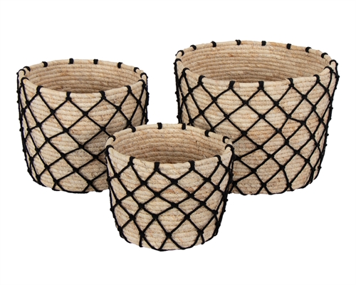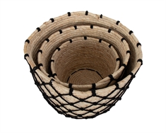 Fletkurve lavet af søgræs - Sæt med 3 stk. Dekorative fletkurve med sorte bomuldssnore. Søgræs er berømt for sin naturlige varme og holdbarhed, hvilket gør det til det ideelle materiale til vores fletkurve. Det er både miljøvenligt og robust, hvilket sikrer, at kurvene kan modstå daglig brug.