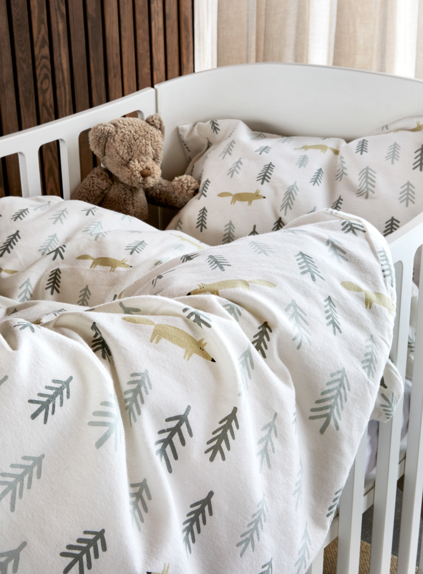 Sengesæt med grønne træer og ræve på en hvid baggrund. Flonel sengetøj fra Høie er fremstillet af 100% bomuldsflonel, som er kendt for sin bløde, let opkradsede og vamsede overflade. Bomuldsfibrene er børstet på overfladen hvilket skaber en ekstra blød og vamset overflade. Denne overflade giver flonel sengetøjet dets karakteristiske og velkendte blødhed og varme, som er med til at skabe en dejlig lun og behagelig sove oplevelse. Især på kølige nætter er sengetøjet en favorit, da 100% bomuldsflonel er åndbart og samtidig god til at holde på varmen.