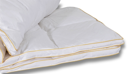 Eksklusiv og varm helårs dobbeltdyne med gåsedun -fra danske Quilts of Denmark. Denne varme helårsdyne er med ekstra fyld og derfor velegnet til folk, som har behov for en lidt varmere og fyldigere dyne. Gåsedun er en af de mest populære duntyper i Danmark og med god grund, da gåsedun er en let type dun som holder rigtig godt på varmen. Dynen er syet i 7x8 kassetter, således at dunene fordeler sig jævnt i dynen og isolerer uden kuldebroer. Dynen er syet med 3 cm. panelkant, således at de fyldige og lette dun isolerer helt ud til dynens kant, dette optimerer udnyttelsen af varmen fra de eksklusive gåsedun. Dynen har en bæreevne på over 12, hvilket er et godt udtryk for dynens kvalitet. Den høje bæreevne er samtidig med til at lade kroppen ånde natten igennem. Bolstret er af 100% blødt og lækkert bomuldssatin, som er så tætvævet at husstøvmider ikke kan trænge igennem.