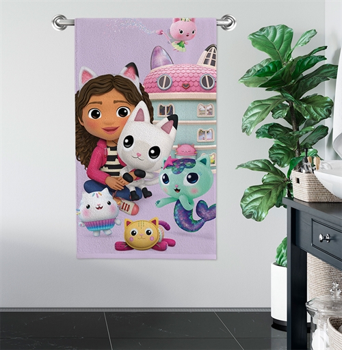 Dette Gabby's Dollhouse håndklæde er en nem opgradering af det kedelige badehåndklæde, samt gør badetid mere interessant og personlig. Håndklædets søde motiv af karakterene, vil helt sikkert vække begejstring hos den lille fan. Børnehåndklædet er lavet af 100% bomuld, hvilket betyder, at det er dejlig blødt og behageligt at bruge. Bomuld er et naturligt blødt materiale, der er skånsomt mod huden, herudover er materialet kendt for sin høje absorberingsevne. Badehåndklædet er udstyret med en strop, hvilket gør det nemt at hænge det op når det skal tørre.