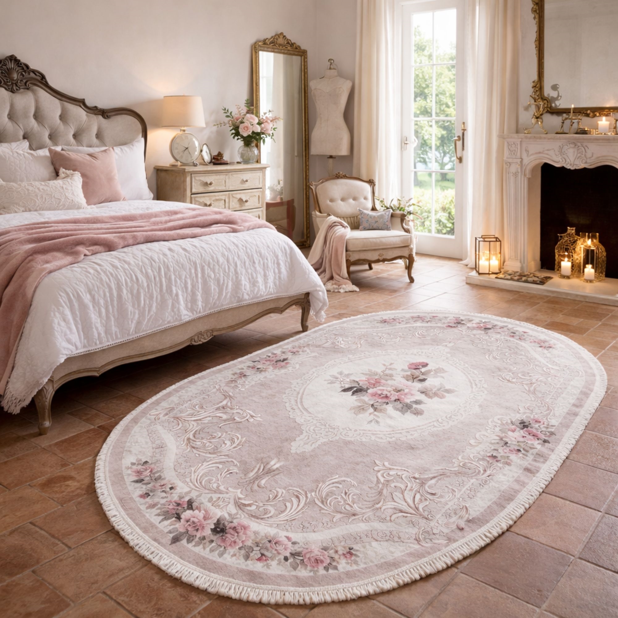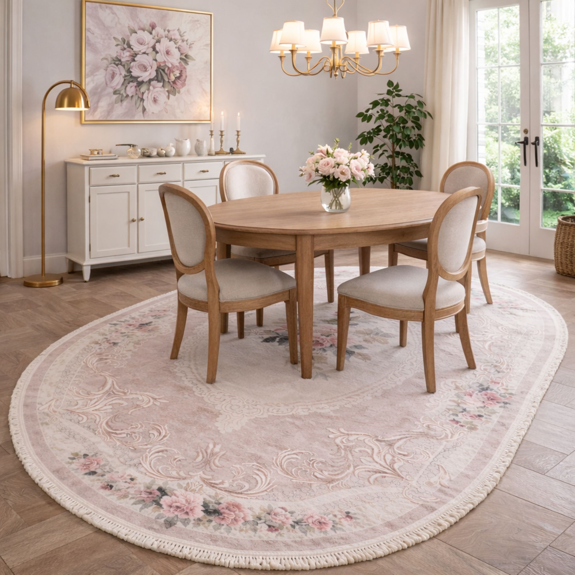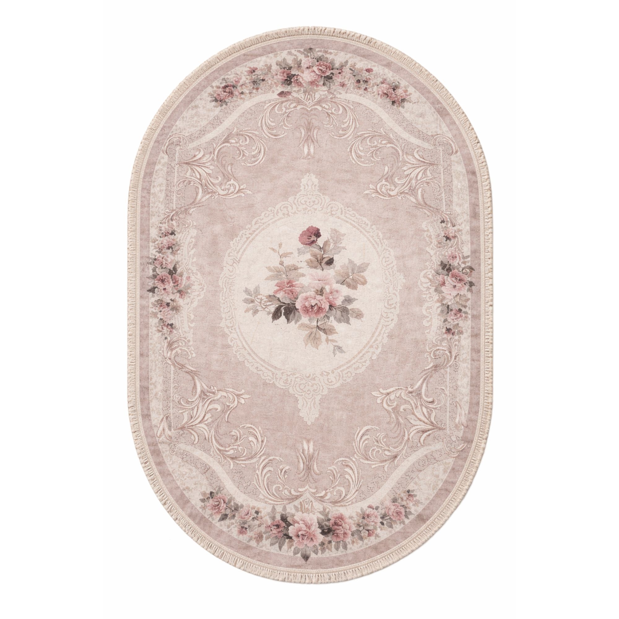 Dette ovale blomstrede gulvtæppe er et oplagt valg, hvis du ønsker et dekorativt tæppe, der både er praktisk, let at vedligeholde og elegant i sit udtryk. Kombinationen af romantisk design og funktionel kvalitet gør det til en stilfuld løsning i enhver bolig.