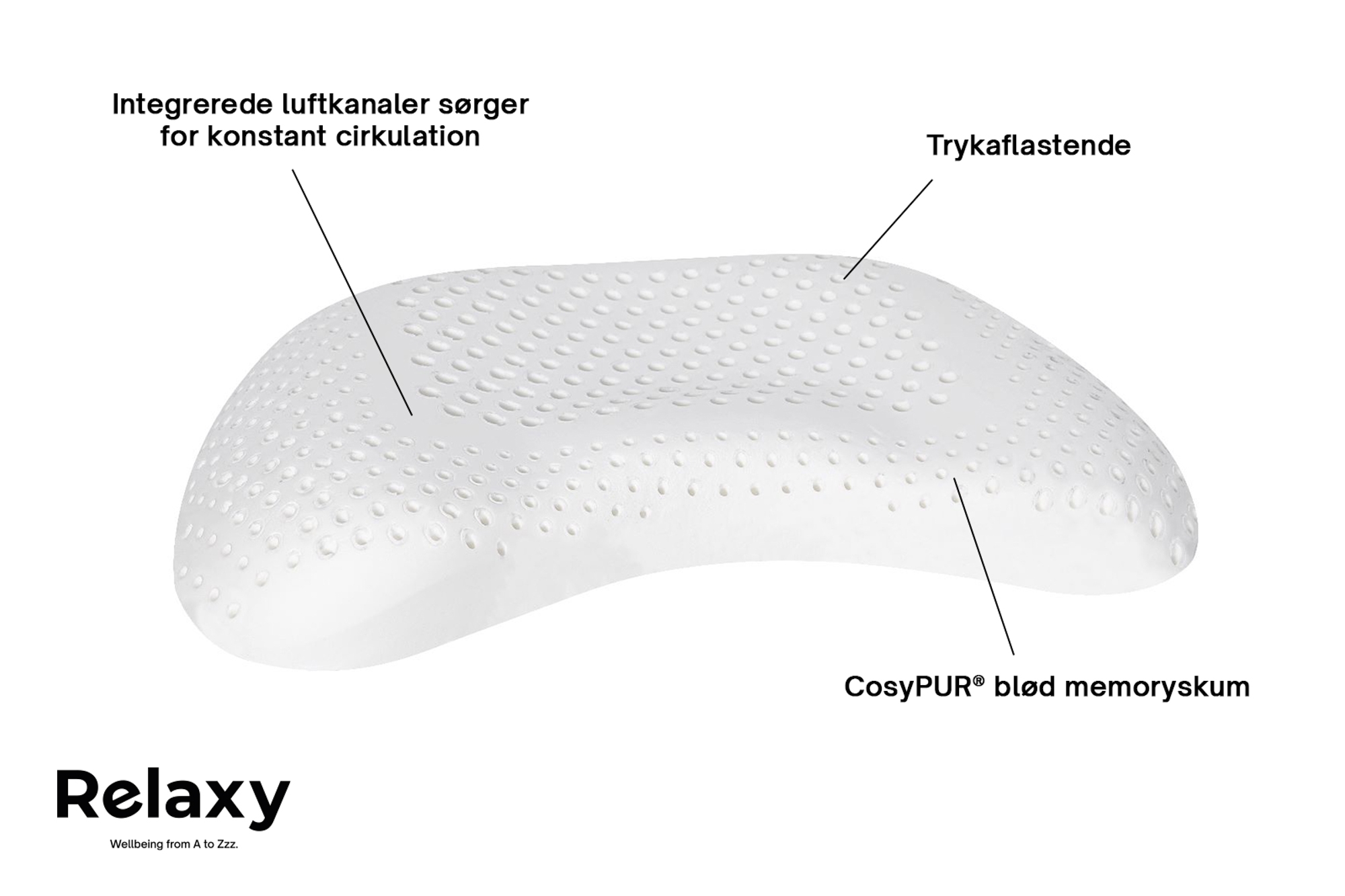 Forside » Hovedpuder Hovedpude med trykaflastende memory skum - Relaxy Moon pude Spar30% Relaxy 999,95699,95DKKSpar 300,- Gratis fragt på denne vareFå på lager Trustpilot Antal Læg i kurv Se mere fra: Relaxy Artikelnummer: REL1002 Læs vores pudeguide Læs om vedligeholdelse af dyner og puder Se vores udvalg af pudebetræk til Relaxy Har du spørgsmål til produktet? Optimal støtte til nakkenVelegnet til allergikereVelegnet til dig, der sover på siden Størrelse: 68x35x9 cm Konstruktion: Kerne af CosyPUR® memoryskum Brand: Relaxy Fyld: CosyPUR® memoryskum Ydre betræk: 65 % polyester, 35 % viskose Indre betræk: 100 % bomuld Vask: 40° skåne (Kun betrækket må vaskes) Tørretumbling: Nej Certificering: STANDARD 100 by OEKO-TEX®. Moon puden er udviklet til dig, der sover på siden. Den måneformede pude er fremstillet af blød og trykaflastende viscoelastisk skum, som yder støtte alle de rigtige steder. Puden har en hul midte, som sørger for solid og komfortabel støtte og hvile til hovedet. Det er den ultimative pude til dig, der sover på siden, da den også giver god støtte til nakke og rigelig plads og ingen belastning til skuldrene. Pudens integrerede luftkanaler sørger for konstant cirkulation, som reducerer varmen og forbedrer dit soveklima. Nem at rulle sammen og tage med. Der medfølger en praktisk taske. Se vores udvalg af pudebetræk til Relaxy puderne her Tilbage til Hovedpuder