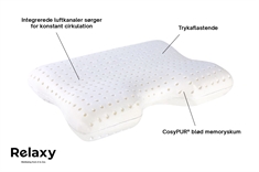 Forside » Hovedpuder Hovedpude med trykaflastende memory skum - Relaxy Wave pude Spar30% Relaxy 999,95699,95DKKSpar 300,- Gratis fragt på denne vareFå på lager Trustpilot Antal Læg i kurv Se mere fra: Relaxy Artikelnummer: REL1004 Læs vores pudeguide Læs om vedligeholdelse af dyner og puder Se vores udvalg af pudebetræk til Relaxy Har du spørgsmål til produktet? Optimal støtte til hovedVelegnet til allergikereVelegnet til dig, der sover på ryggen Størrelse: 54x40x11 cm Konstruktion: Kerne af CosyPUR® memoryskum Brand: Relaxy Fyld: CosyPUR® memoryskum Ydre betræk: 65 % polyester, 35 % viskose Indre betræk: 100 % bomuld Vask: 40° skåne (Kun betrækket må vaskes) Tørretumbling: Nej Certificering: STANDARD 100 by OEKO-TEX®. Wave puden bliver din bedste ven for evigt, hvis du elsker at sove på ryggen. Den løfter let dit hoved og gør det meget nemmere for dig at trække vejret under søvnen. Det bløde og trykaflastende CosyPUR® skum tilpasser sig din soveposition og giver ideel støtte under søvnen samtidigt med at den løfter hovedet en anelse, hvilket giver luftvejene den bedste position, så du ubesværet kan trække vejret. Pudens integrerede luftkanaler sørger for konstant cirkulation, som reducerer varmen og forbedrer dit soveklima. Nem at rulle sammen og tage med. Der medfølger en praktisk taske. Se vores udvalg af pudebetræk til Relaxy puderne her Tilbage til Hovedpuder