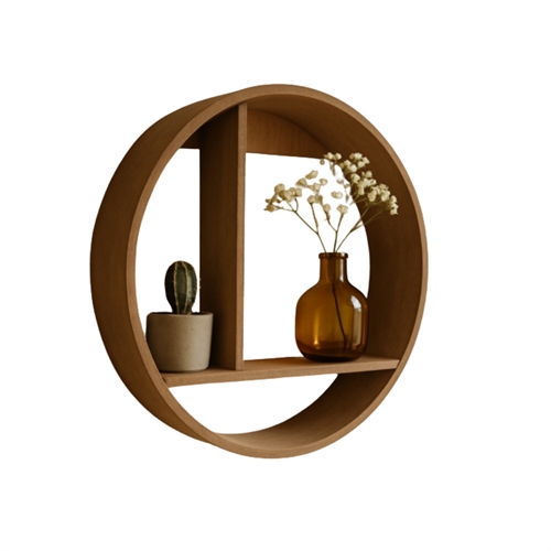 Skab et stilfuldt og personligt udtryk i dit hjem med denne runde væghylde i træ. Med sit moderne og dekorative design er hylden både praktisk og flot - perfekt til at fremhæve dine yndlingsgenstande.