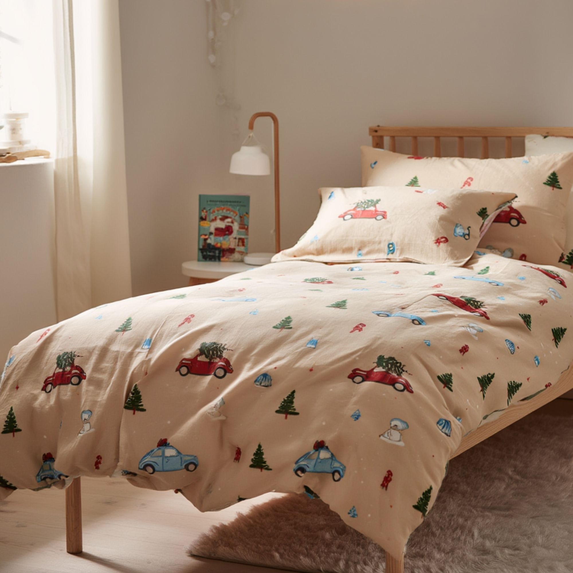 Gør december ekstra hyggelig med dette stemningsfulde julesengetøj fra By Mats. Det beige design med biler og juletræer skaber en magisk julestemning på børneværelset og gør sengetid til noget helt særligt i juletiden.
