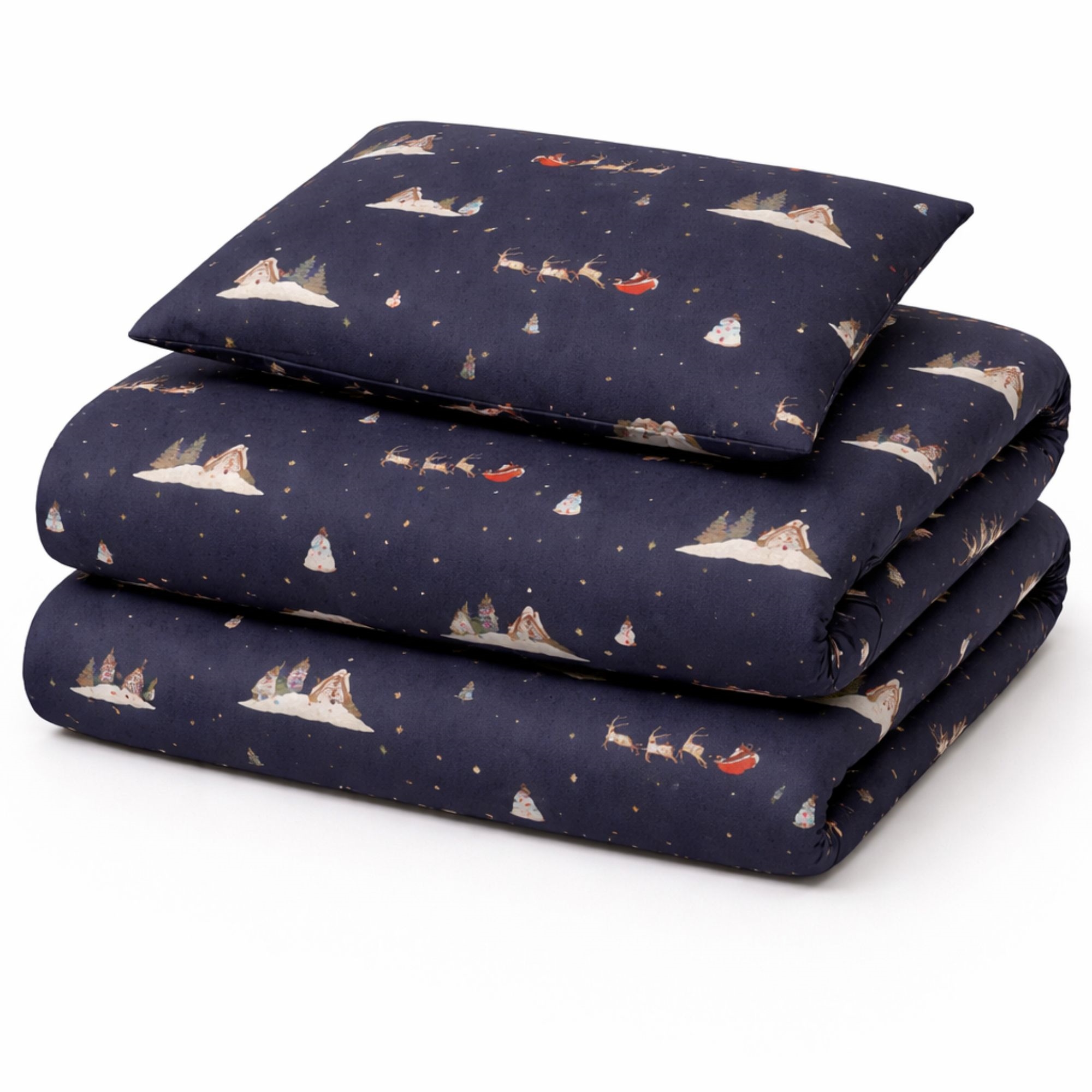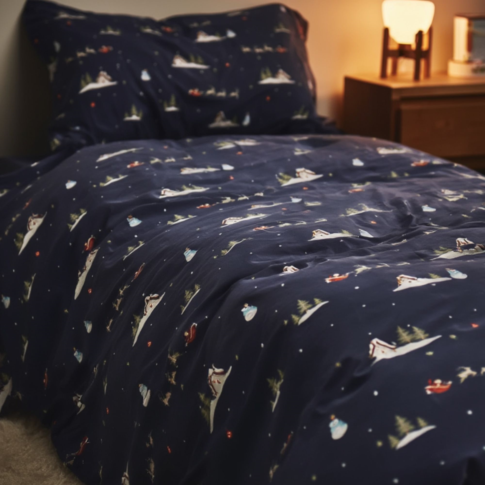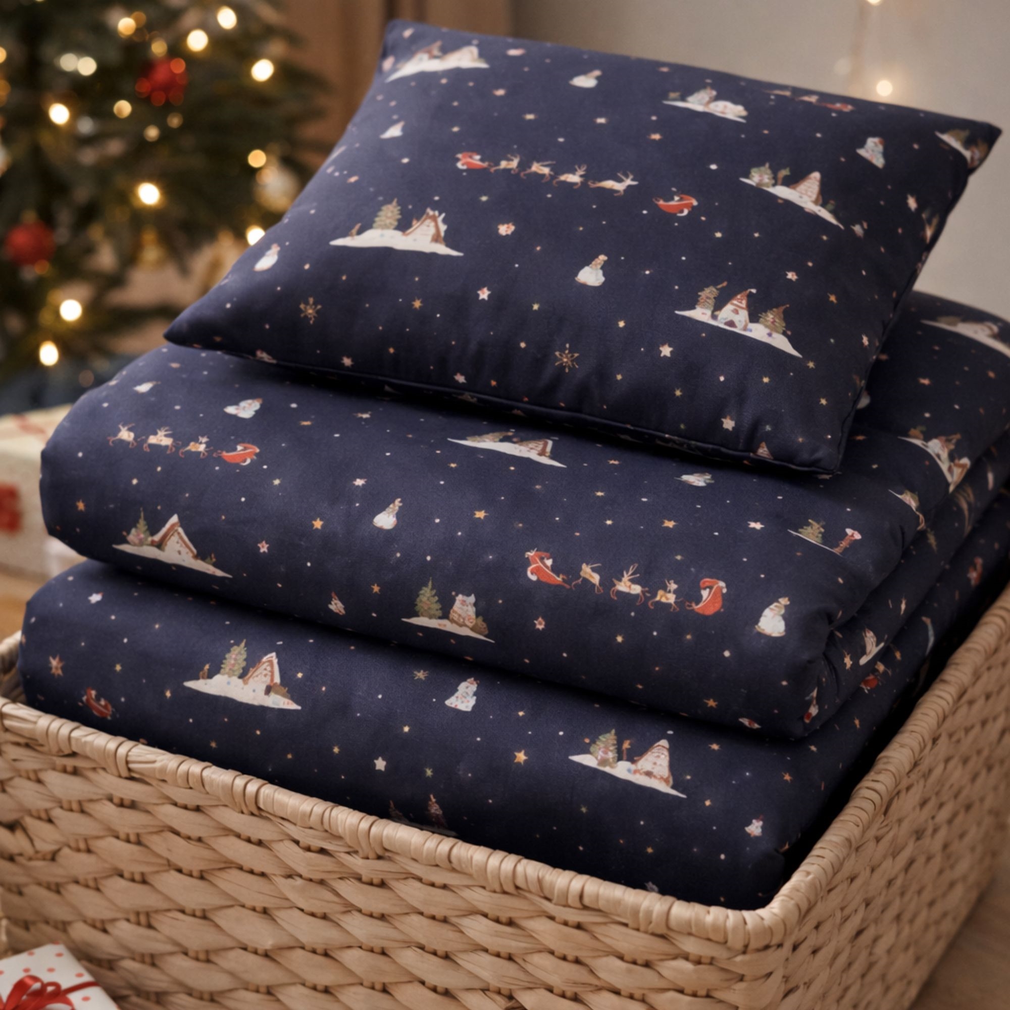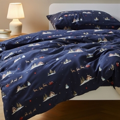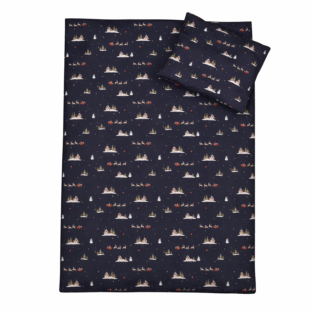 Gør december ekstra hyggelig med dette stemningsfulde julesengetøj fra By Mats. Det mørkeblå design med julemænd, rensdyr og små vintermotiver skaber en magisk julestemning på børneværelset og gør sengetid til noget helt særligt i juletiden.