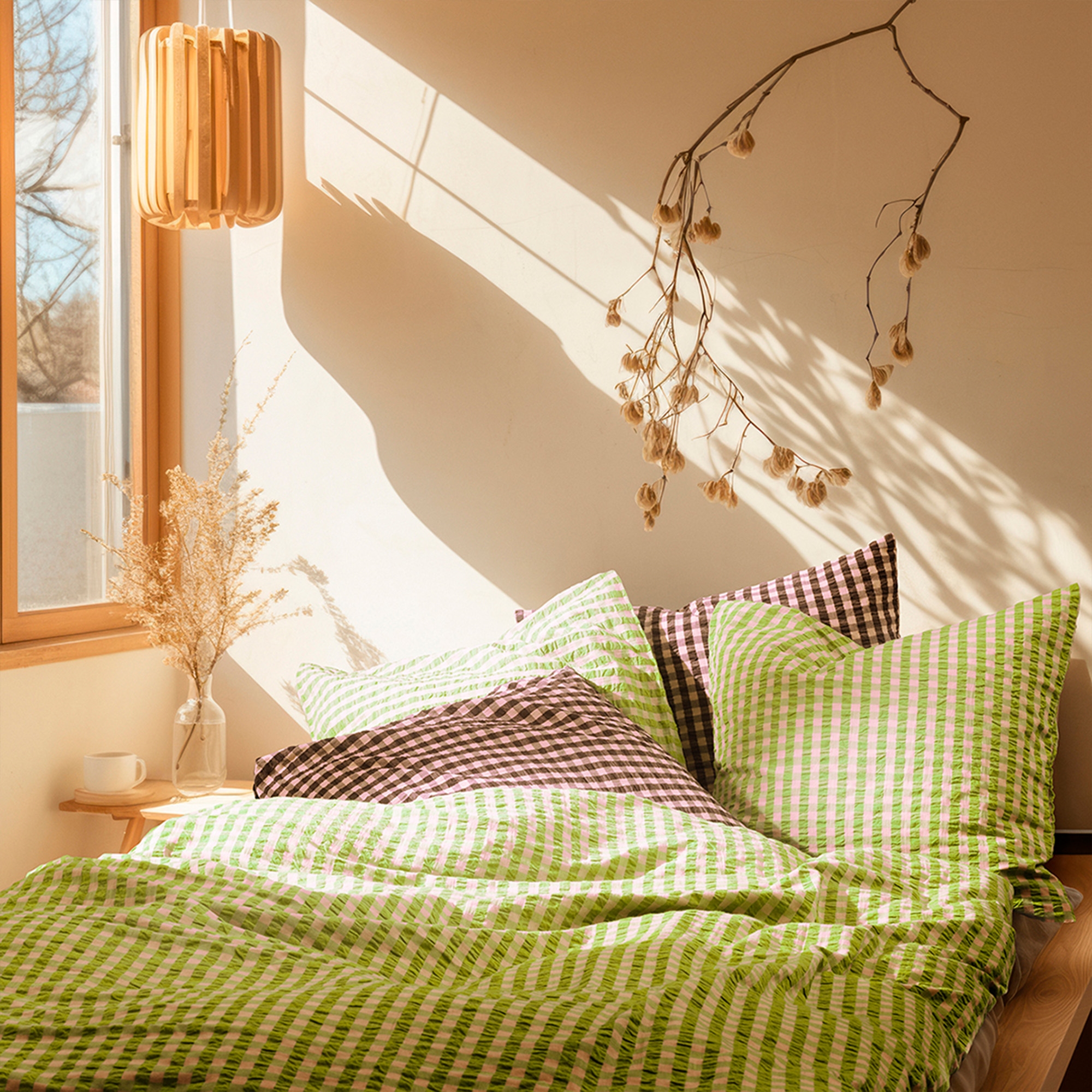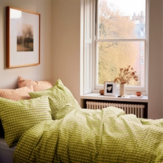 Det bløde bomuld kombineret med den krøllede struktur giver en unik følelse af luksus. Samtidig er sengetøjet praktisk i hverdagen, da det ikke kræver strygning og holder sit flotte udtryk vask efter vask. De fine tern i grøn giver et roligt og stilrent look, der passer ind i både moderne og klassiske soveværelser.