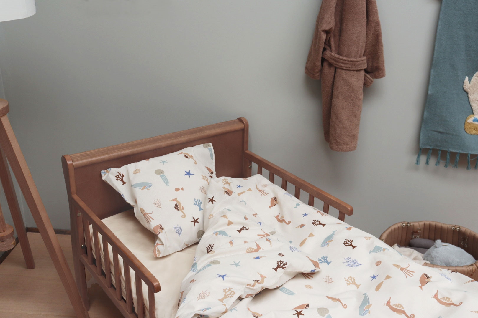 Forside » Sengetøj Junior sengetøj - 100% Blødt bomuld - 115x135 cm - Sengesæt med undervands motiver til børn Spar35% By Mats 199,95129,95DKKSpar 70,- På lager Trustpilot Antal Læg i kurv Se mere fra: By Mats Artikelnummer: 12118-27 Læs vores sengetøjsguide Se vores store udvalg af lagner Se vores store udvalg af dyner 100x140 Har du spørgsmål til produktet? Motiv med nordisk inspiration100% blødt bomuld - åndbart og behageligtOEKO-TEX® Certificeret Dynebetræk: 115x135 cm (bemærk størrelse) Pudebetræk: 40x45 cm Materiale: 100% bomuld Farve: Hvid Motiv: Undervands motiver Lukning: Dyne med knapper og pudebetræk med overlap Vask: 60 grader Tørretumbling: Ja Tåler strygning: Ja (OBS: Bemærk størrelsen) Certificering: STANDARD 100 by OEKO-TEX® (2016OK0709) Skønt sengesæt med fint og unikt print til både piger og drenge. Sengetøjet er blødt og behageligt, så dit barn opnå en tryg og rolig søvn. Dette flotte allover print i dæmpede farver, vil pynte og være dekorativt på børneværelset. Dynebetrækket er nemt at håndtere med smarte trykknapper, mens pudebetrækket har en praktisk overlapning. Skab en drømmeverden med dette charmerende sengesæt – sovetid bliver nu en leg. Sengetøjet er lavet af 100% blødt bomuld. Bomuld er åndbart, blødt og behageligt mod barnets hud. Derudover er det nemt at vaske, hvilket er afgørende, når det kommer til sengetøj til børn, der ofte kan ende med at blive plettet. Et behageligt og hyggeligt sengetøj bidrager til at skabe en beroligende atmosfære, der fremmer en god nattesøvn. Du finder vores sortiment af kvalitets lagner her til børn her Vi har alt til at gøre ungernes værelse magisk og hyggeligt, hvor de for alvor kan fordybe sig i deres mange forskellige lege og for alvor slippe deres fantasi løs. Se vores udvalg til børneværelset her Tilbage til Sengetøj Måske er du også interesseret i: Junior sengetøj 100x140 cm - Blødt hvidt sengesæt i 100% egyptisk bomuldssatin - Turiform sengelinnedHøj kvalitet Ekstra fin, blød & åndbar Jacquardvævet Vejl. udsalgspris : 449,95 Spar : 204,95 499,95 DKK245,00 DKK Junior rullemadras - 70x140 cm - Kogeægte Bomuld - Borg LivingÅndbart og allergivenlig Blødt bomuld OEKO-TEX® certificeret 349,95 DKK199,95 DKK