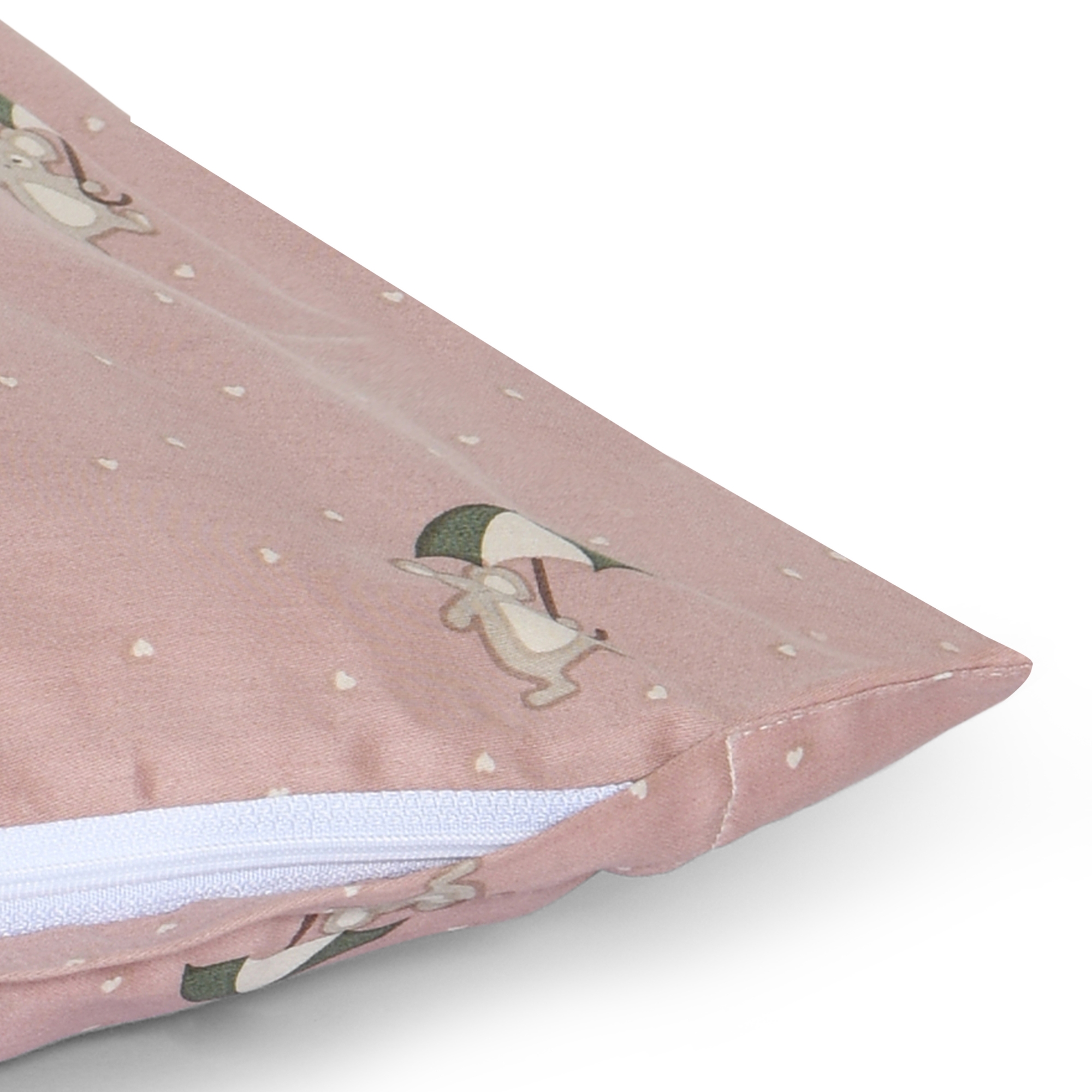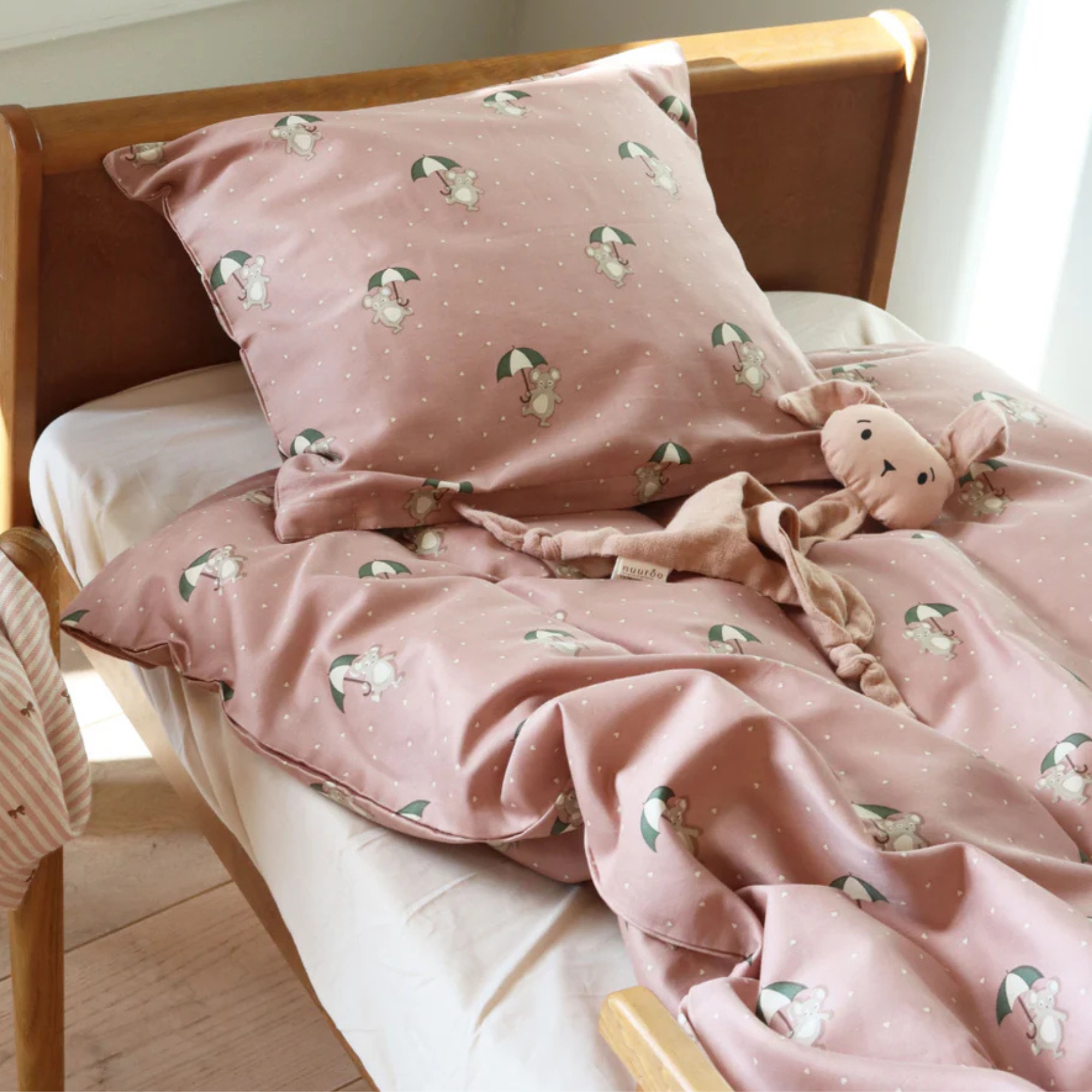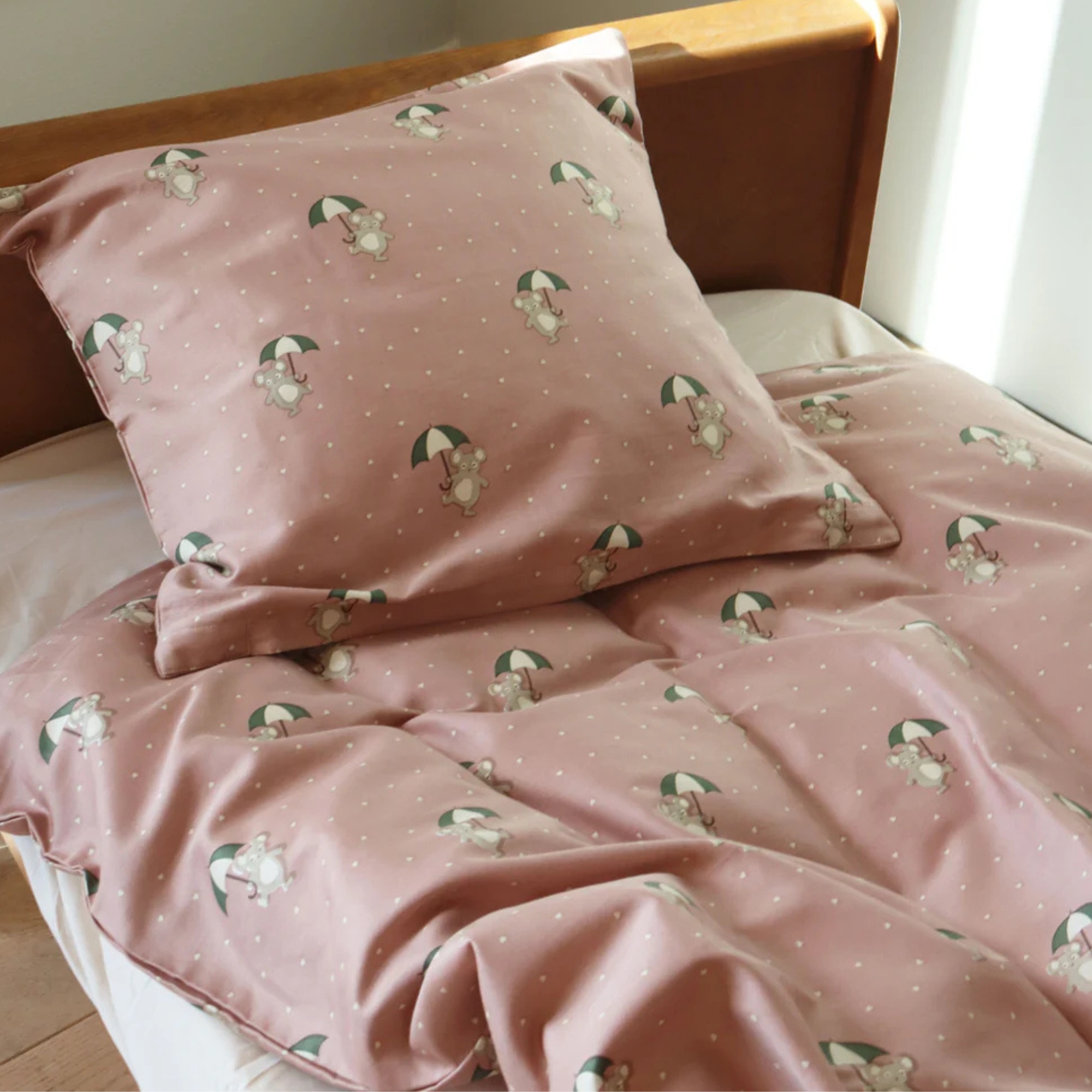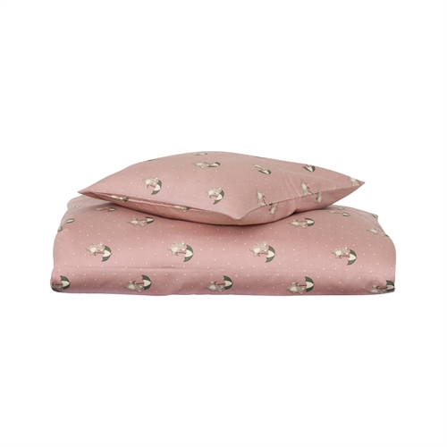 Dette søde junior sengesæt har et hyggeligt design med små mus, der holder paraplyer. Den bløde rosa baggrund kombineret med de fine detaljer skaber et varmt og roligt udtryk, som passer perfekt til et hyggeligt børneværelse.
