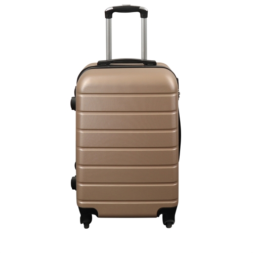 Lille og praktisk kabinekuffert i en flot guldarve, med vandrette linjer.