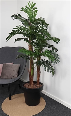 Denne kunstige Areca palme er din mulighed for at bringe en smule tropisk atmosfære ind i dit hjem eller på kontoret uden bekymringer om vedligeholdelse. Denne naturtro plante er flot og fyldig, skaber liv i ethvert rum og passer perfekt ind i en stue, entre eller hall. Med en højde på 185 cm og en diameter på 110 cm er dette Areca palmetræ iøjnefaldende og tilføjer et eksotisk præg til din indretning.